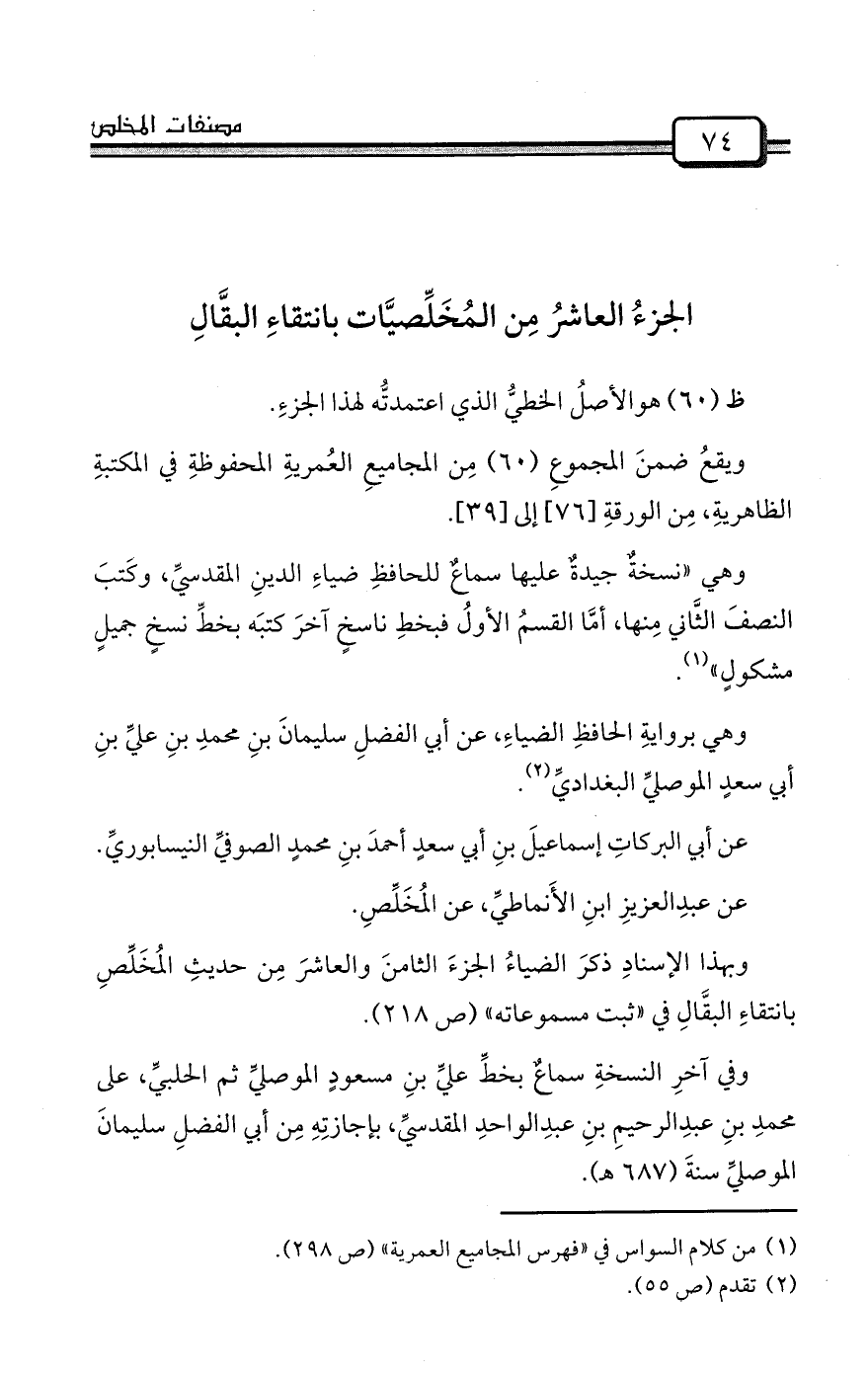وبهذا الإسنادِ ذكرَ الضياءُ الجزءَ الثامنَ والعاشرَ مِن حديثِ المُخَلِّصِ بانتقاءِ البقَّالِ في «ثبت مسموعاته» (ص 218) .