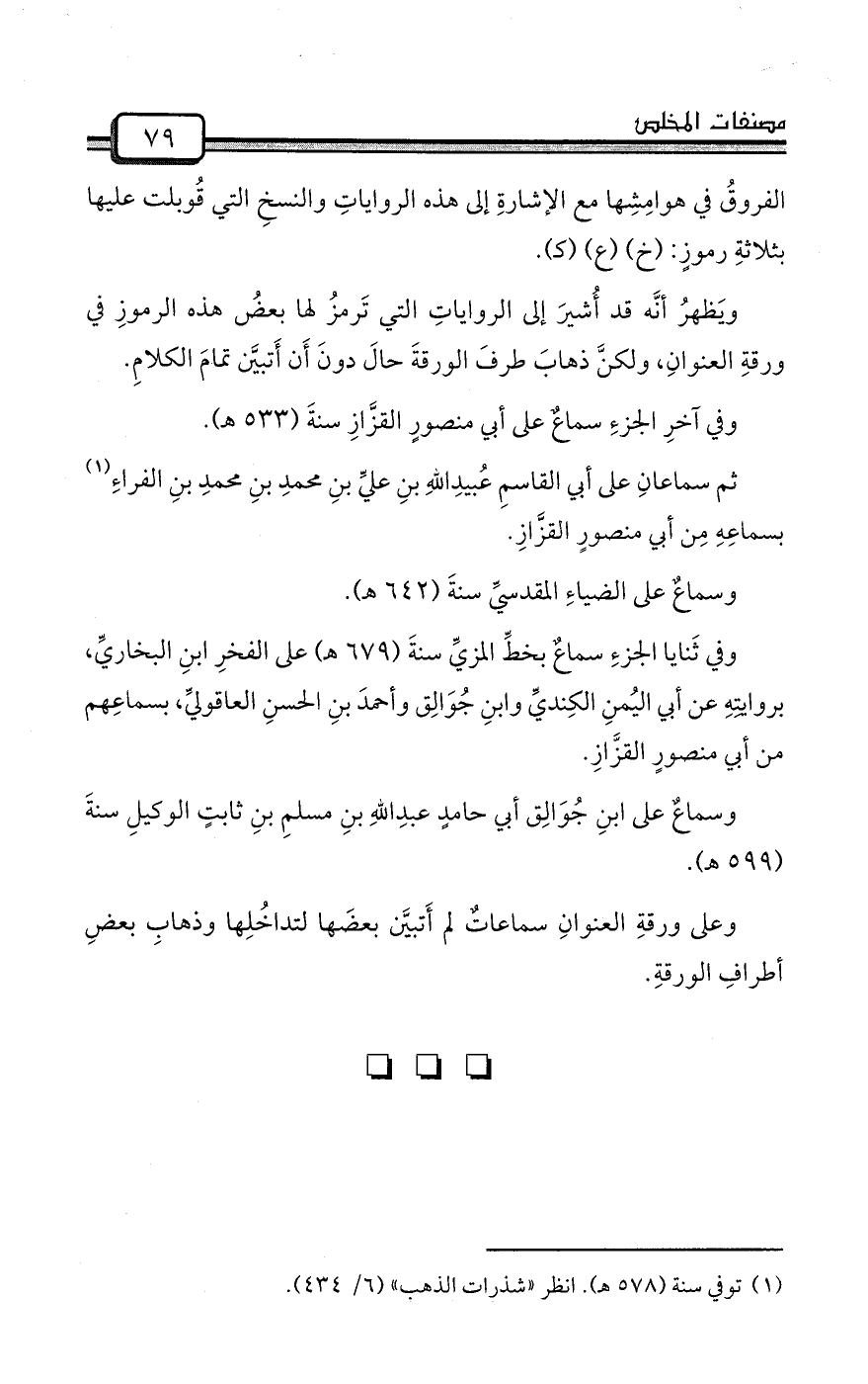 وفي ثَنايا الجزءِ سماعٌ بخطِّ المزيِّ سنةَ (679 هـ) على الفخرِ ابنِ البخاريِّ، بروايتِهِ عن أبي اليُمنِ الكِنديِّ وابنِ جُوَالِق وأحمدَ بنِ الحسنِ العاقوليِّ، بسماعِهم من أبي منصورٍ القزَّازِ.