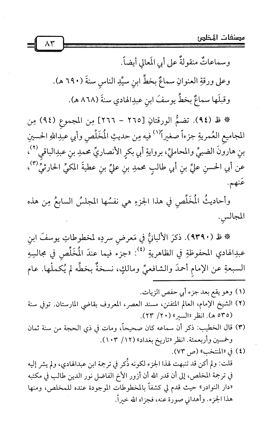 قلت: ولم أكن قد تنبهت لهذا الجزء لكونه ذُكر في ترجمة ابن عبد الهادي، ولم يشر إليه في ترجمة المخلص، إلى أن قدر الله أن أزور الأخ الفاضل نور الدين طالب في مكتبه «دار النوادر» حيث قدم لي كشفاً بالمخطوطات الموجودة عنده للمخلص، ومنها هذا الجزء. وأهداني صورة عنه، فجزاه الله خيراً.