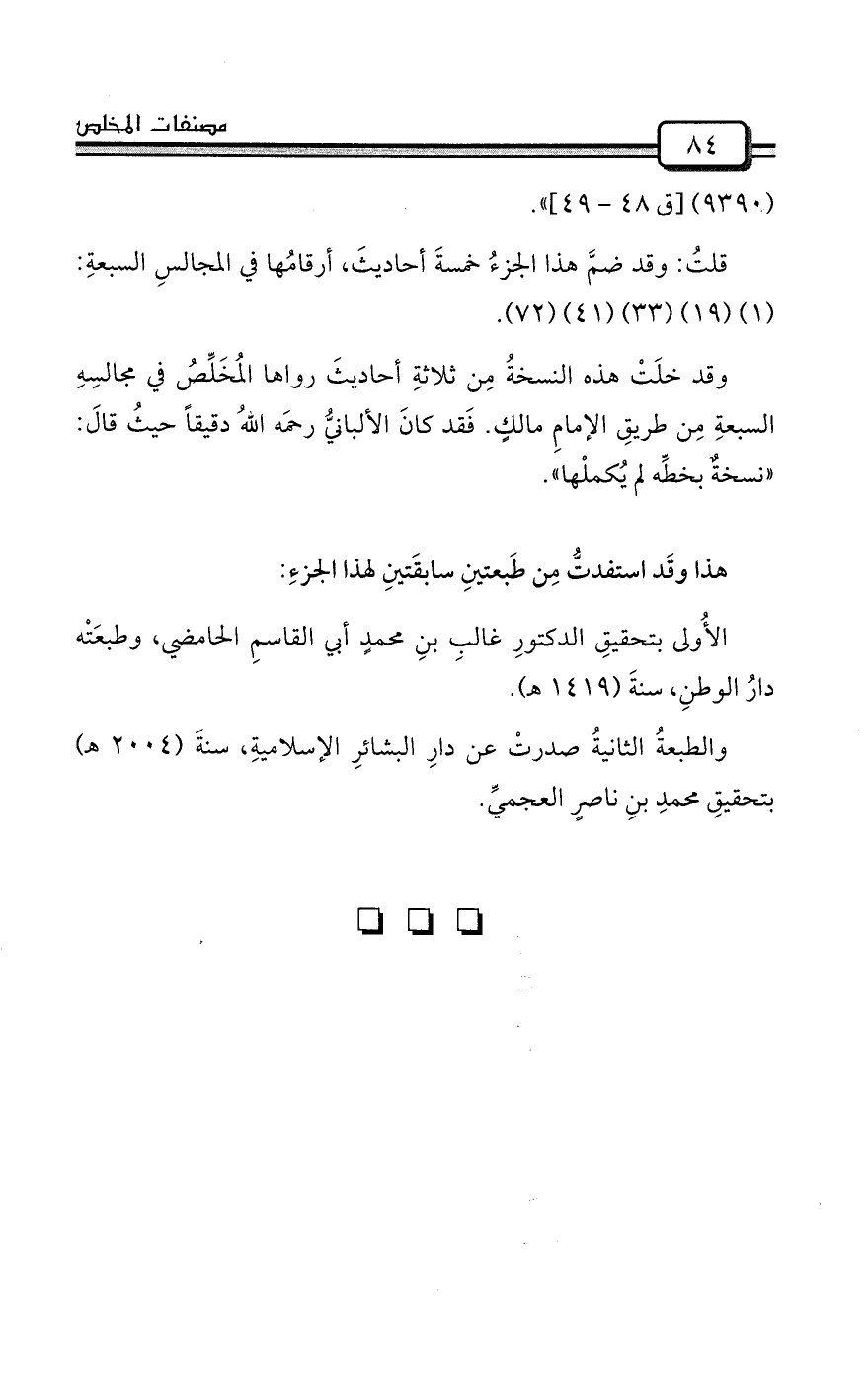 وقد خلَتْ هذه النسخةُ مِن ثلاثةِ أحاديثَ رواها المُخَلِّصُ في مجالسِهِ السبعةِ مِن طريقِ الإمامِ مالكٍ. فَقد كانَ الألبانيُّ رحمَه اللهُ دقيقاً حيثُ قالَ: «نسخةٌ بخطِّه لم يُكملْها» .