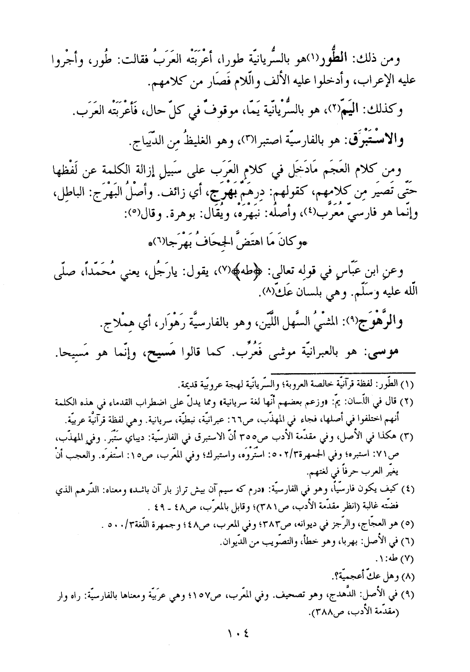 ومن ذلك: الطور هو بالسريانية طورا، أعربته العرب فقالت: طور، وأجروا عليه الإعراب، وأدخلوا عليه الألف واللام فصار من كلامهم.