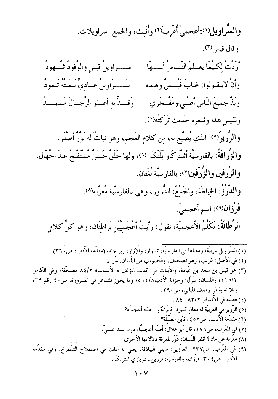 والسراويل: أعجمي أعرب وأنث، والجمع: سراويلات.