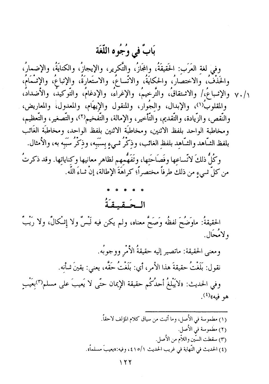 وفي لغة العرب: الحقيقية، والمجاز، والتكرير، والإيجاز، والكناية، والإضمار، والحذف، والاختصار، والحكاية، والاتساع، والاستعارة، والإتباع، والإشمام، والإشباع، والاشتقاق، والترخيم، والإغراء، والإدغام، والتوكيد، والأضداد، والمقلوب، والإبدال، والجُوار، والمنقول والإيهام، والمعدول، والمعاريض، والنقص، والزيادة، والتقديم، والتأخير، والإمالة، والتفخيم، والتصغير، والتعظيم، ومخاطبة الواحد بلفظ الاثنين، ومخاطبة الاثنين بلفظ الواحد، ومخاطبة الغائب بلفظ الشاهد والشاهد بلفظ الغائب، وذكر شيء بسببه، وذكر سببه به، والأمثال.