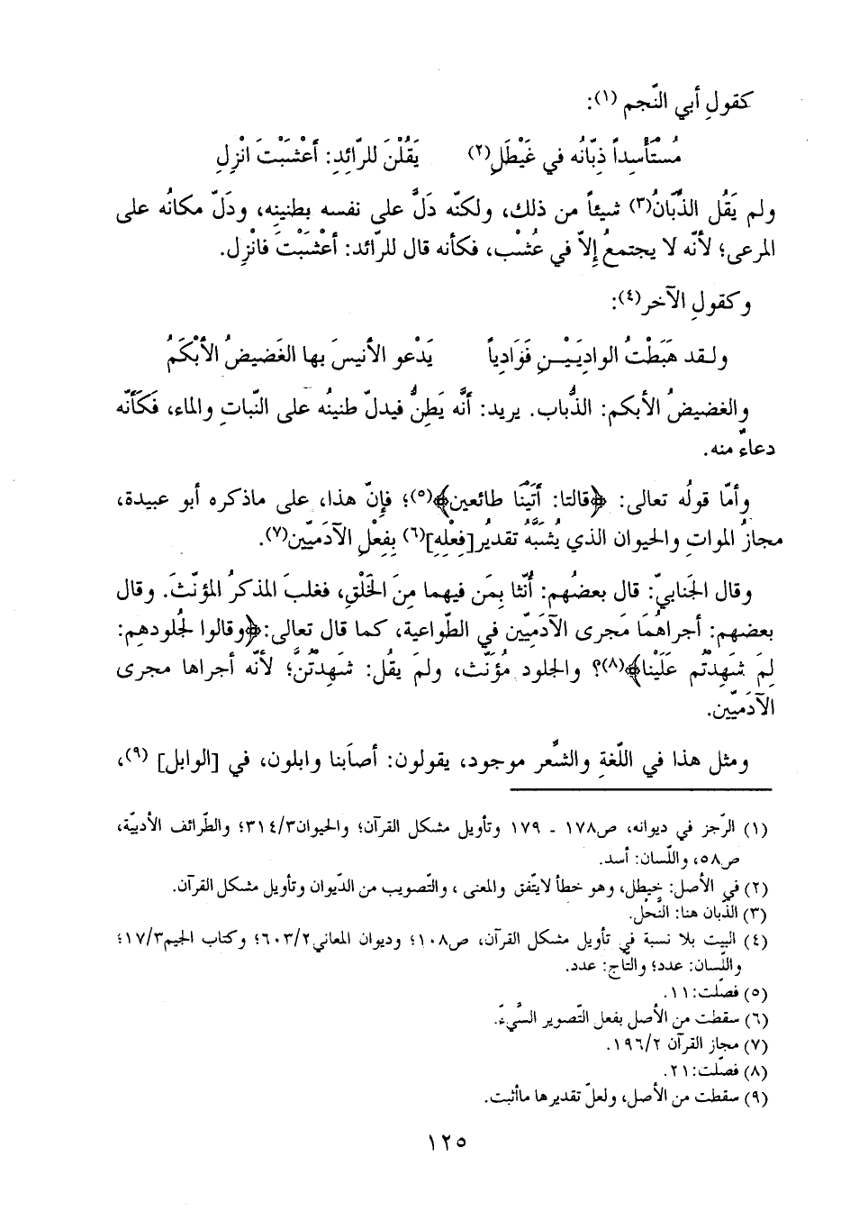 وأما قوله تعالى: {قَالَتَا أَتَيْنَا طَائِعِينَ}؛ فإن هذا، على ما ذكره أبو عبيدة، مجاز الموات والحيوان الذي يشبه تقدير [فعله] بفعل الآدميين.