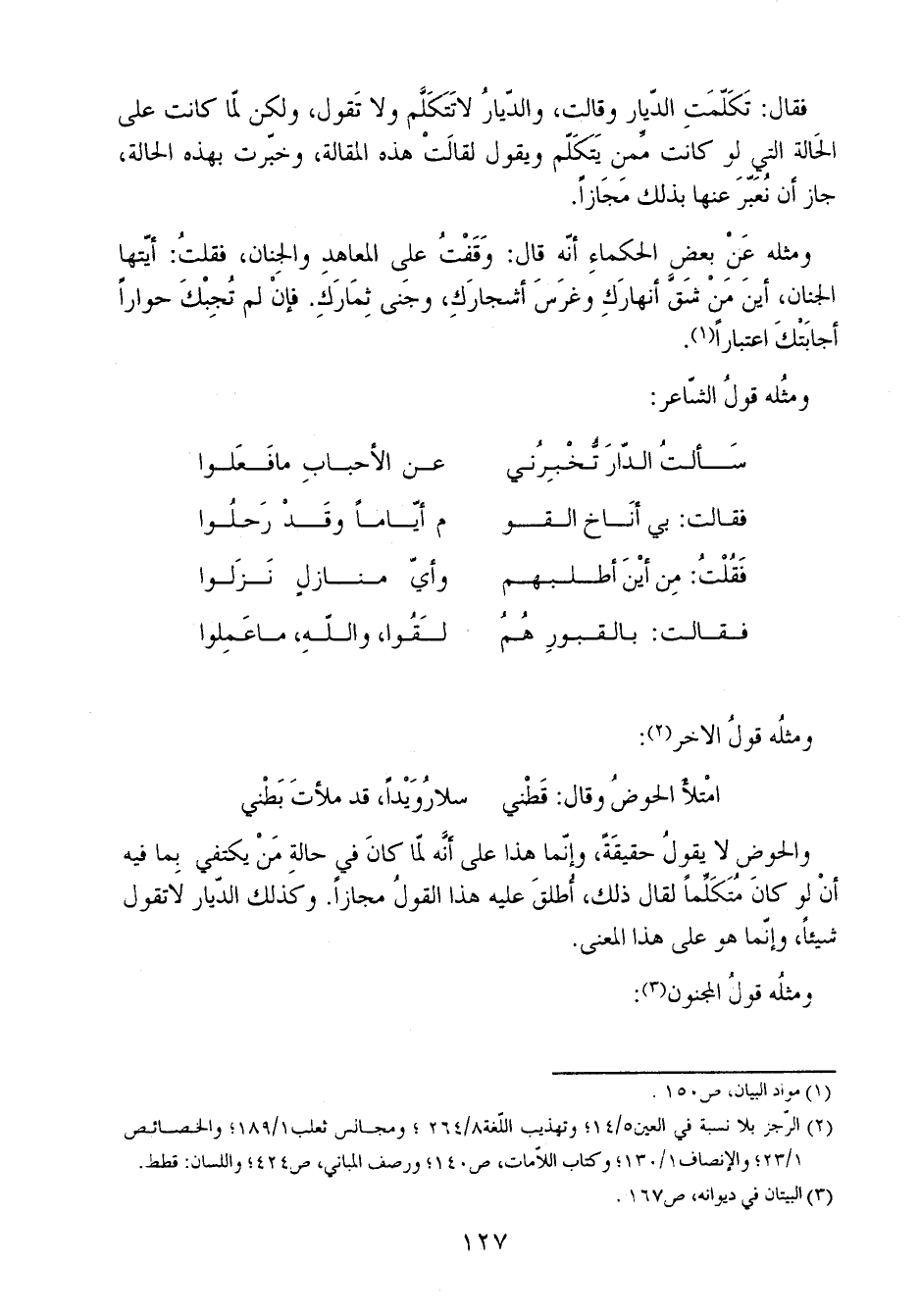 والحوض لا يقول حقيقة، وإنما هذا على أنه لما كان في حالة من يكتفي بما فيه أن لو كان متكلماً لقال ذلك، أطلق عليه هذا القول مجازاً. وكذلك الديار لا تقول شيئاً، وإنما هو على هذا المعنى.
