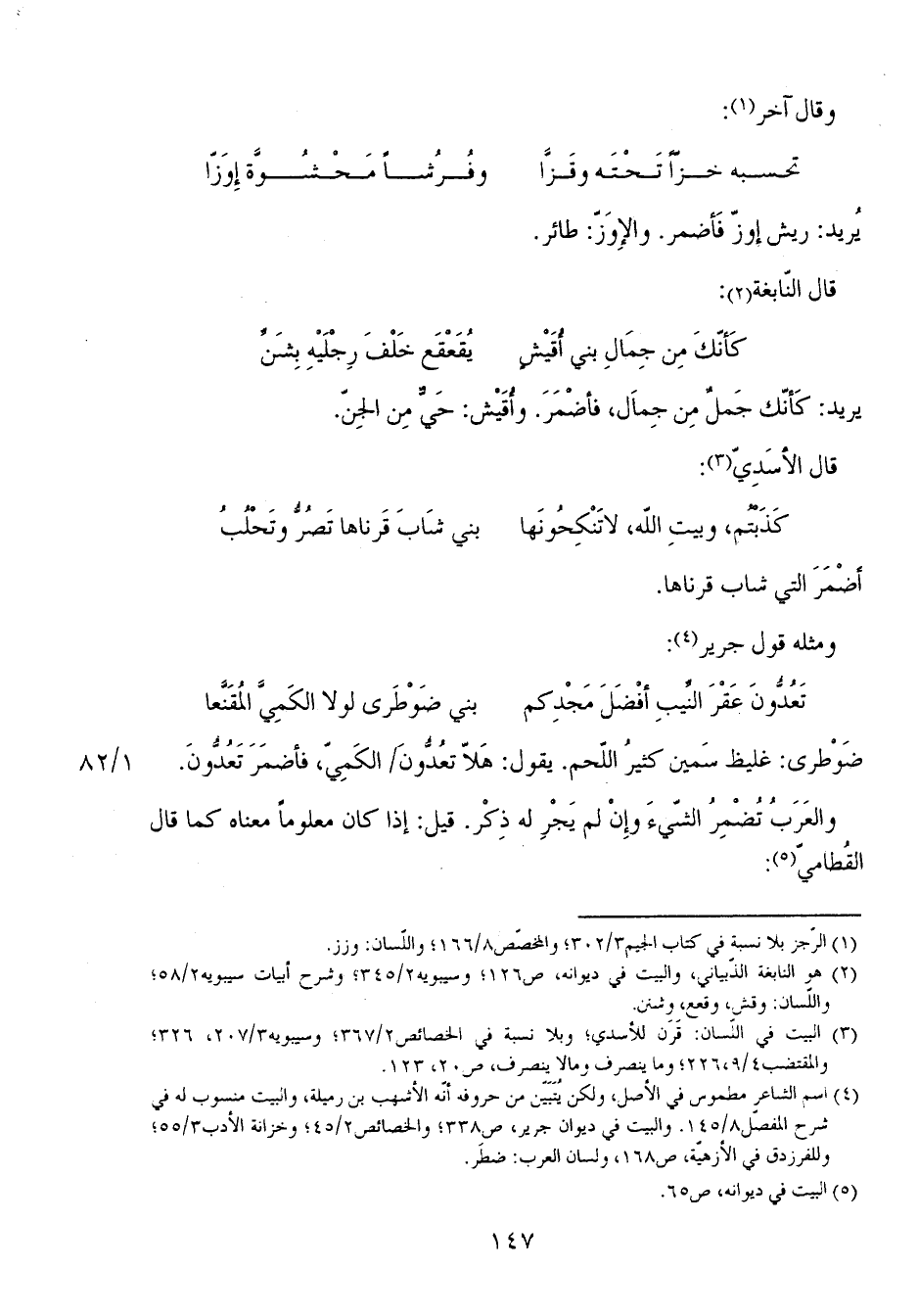 والعرب تضمر الشيء وإن لم يجر له ذكر. قيل: إذا كان معلوماً معناه كما قال القطامي: