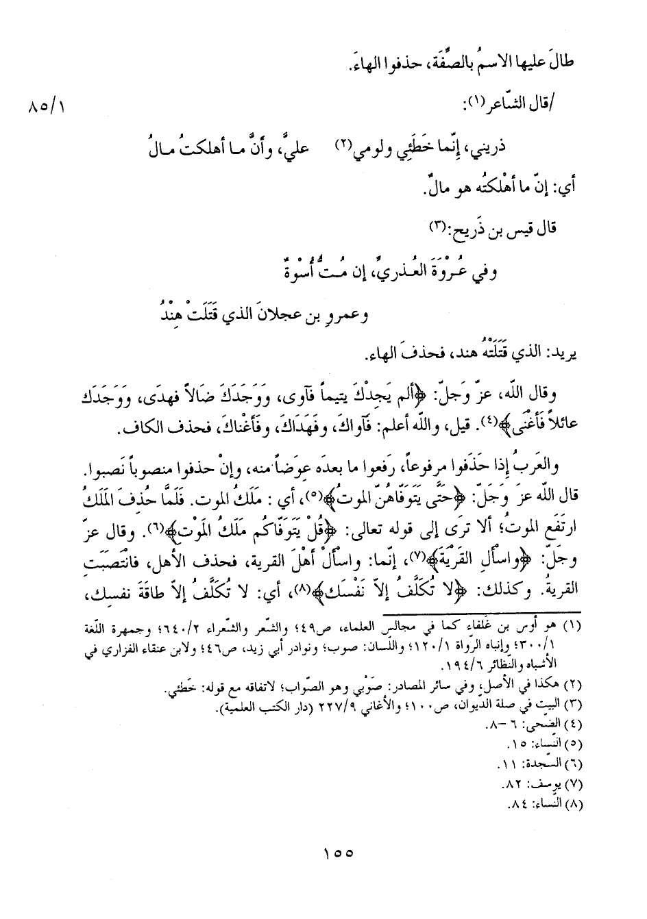 والعرب إذا حذفوا مرفوعاً، رفعوا ما بعده عِوَضاً منه، وغن حذفوا منصوباً نصبوا. قال الله عز وجل: {حَتَّى يَتَوَفَّاهُنَّ الْمَوْتُ}، أي: مَلَكُ الموت. فلما حُذف الملَك ارتفع الموت؛ ألا ترى إلى قوله تعالى: {قُلْ يَتَوَفَّاكُمْ مَلَكُ الْمَوْتِ}. وقال عز وجل: {وَاسْأَلْ الْقَرْيَةَ}، إنما: واسأل أهل القرية، فحذف الأهل، فانتصبت القرية. وكذلك: {لا تُكَلَّفُ إِلاَّ نَفْسَكَ}، أي: لا تكلَّف إلا طاقة نفسِك،