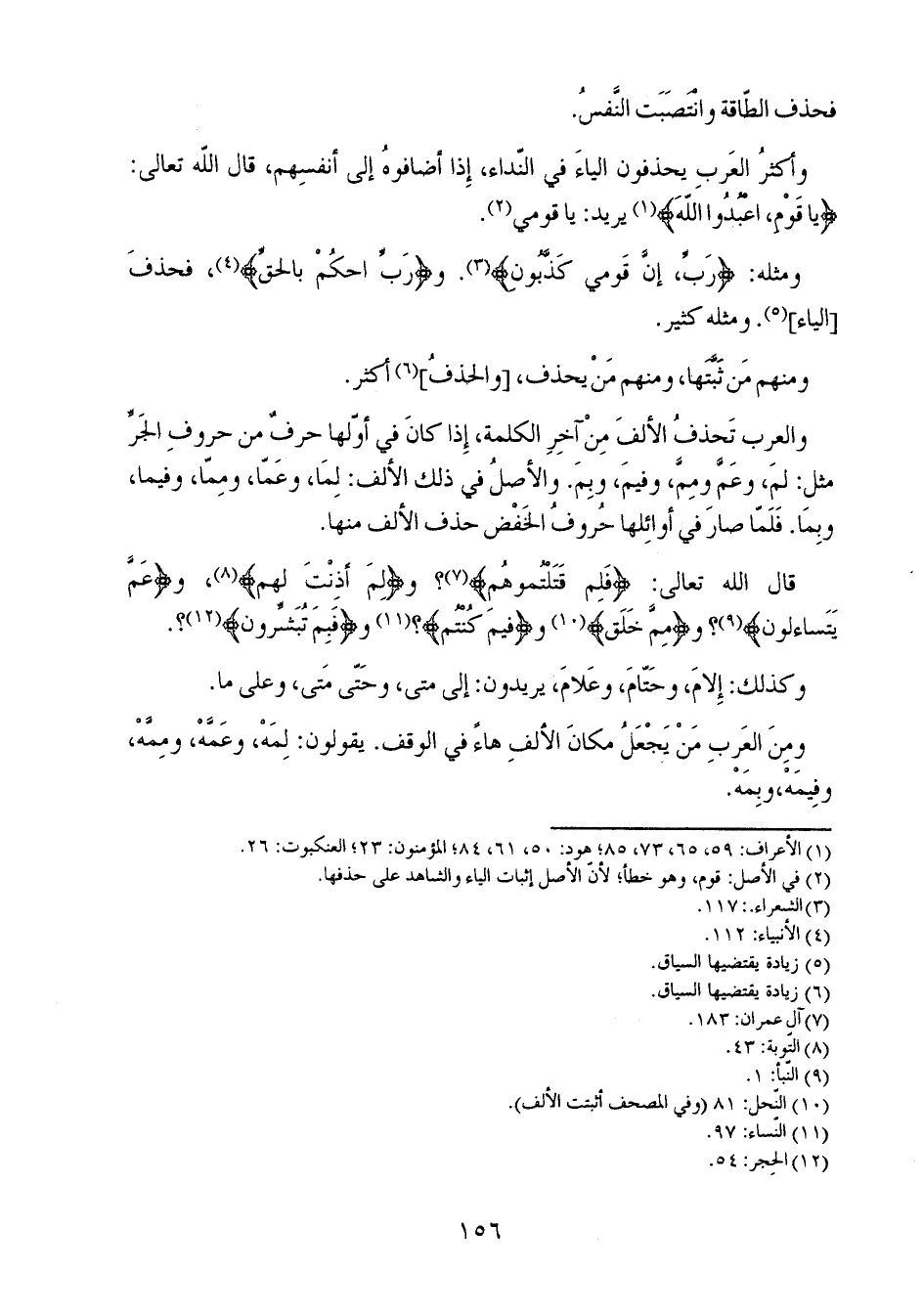 قال الله تعالى: {فَلِمَ قَتَلْتُمُوهُمْ}؟ و {لِمَ أَذِنتَ لَهُمْ}، و {عَمَّ يَتَسَاءَلُونَ}؟ و {مِمَّ خُلِقَ} و {فِيمَ كُنتُمْ}؟ و {فَبِمَ تُبَشِّرُونَ}؟.