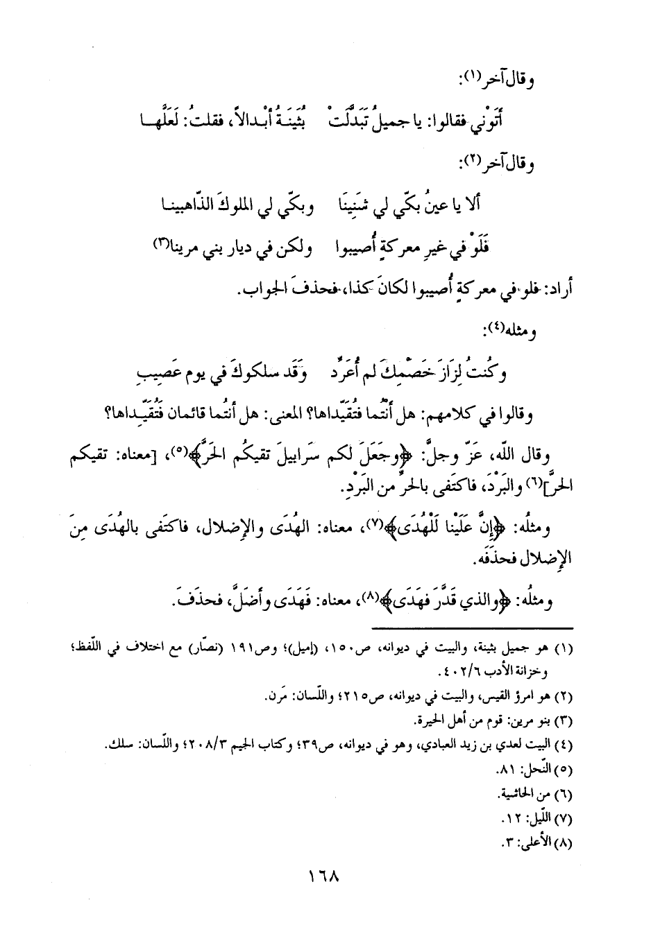 وقال الله، عز وجل: {وَجَعَلَ لَكُمْ سَرَابِيلَ تَقِيكُمْ الْحَرَّ}، [معناه: تقيكم الحر] والبرد، فاكتفى بالحر من البرد.