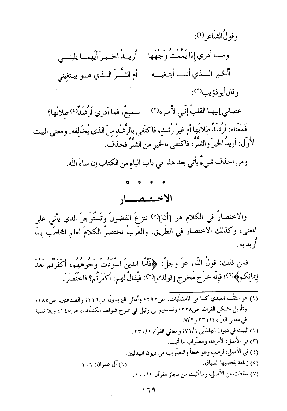 والاختصار في الكلام هو [أن] تنزع الفضول وتستوجز الذي يأتي على المعنى، وكذلك الاختصار في الطريق. والعرب تختصر الكلام لعلم المخاطب بما أريد به.