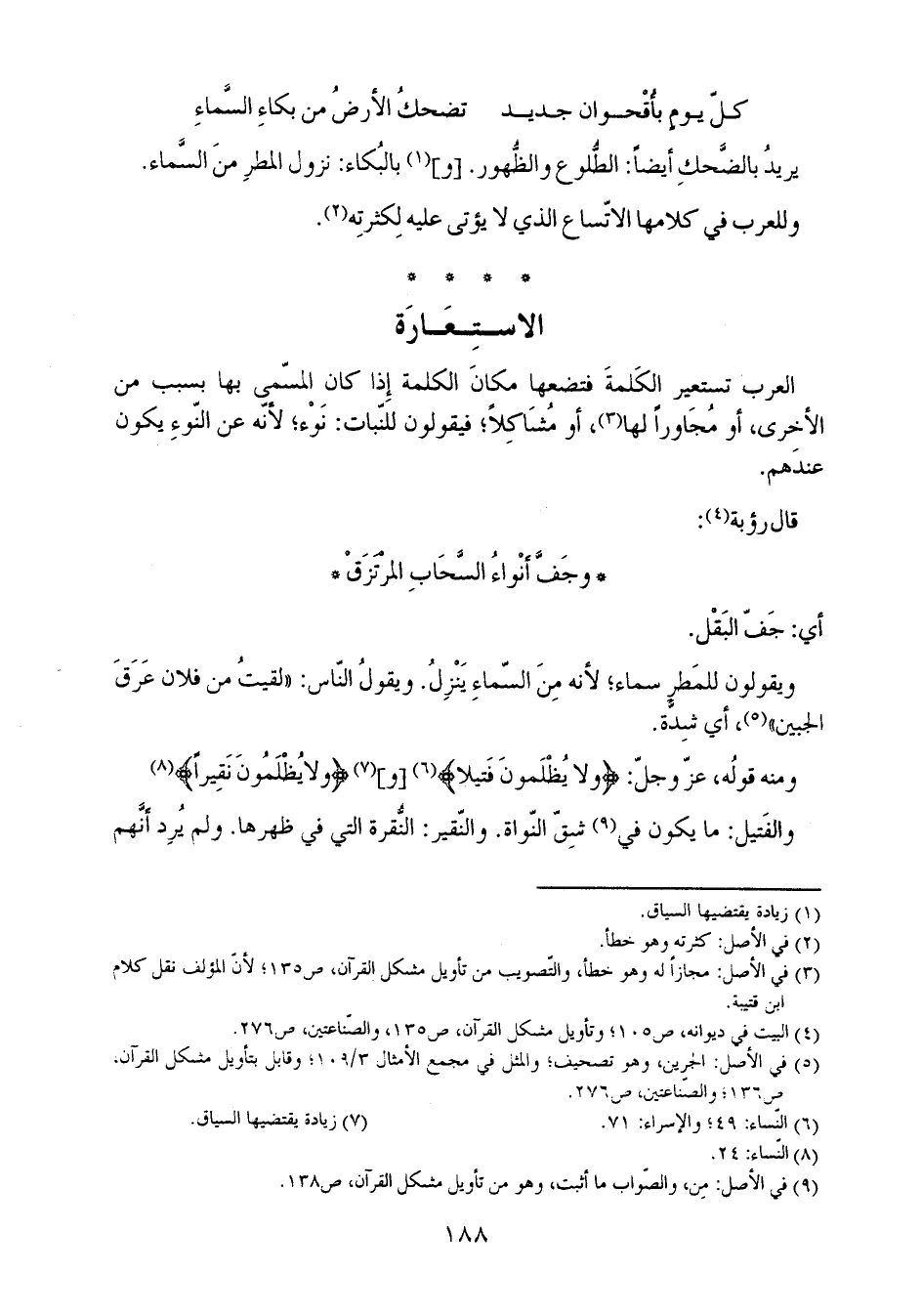 العرب تستعير الكلمة فتضعها مكان الكلمة إذا كان المسمى بها بسبب من الأخرى، أو مجاوراً لها، أو مشاكلاً؛ فيقولون للنبات: نوء؛ لأنه عن النوء يكون عندهم.