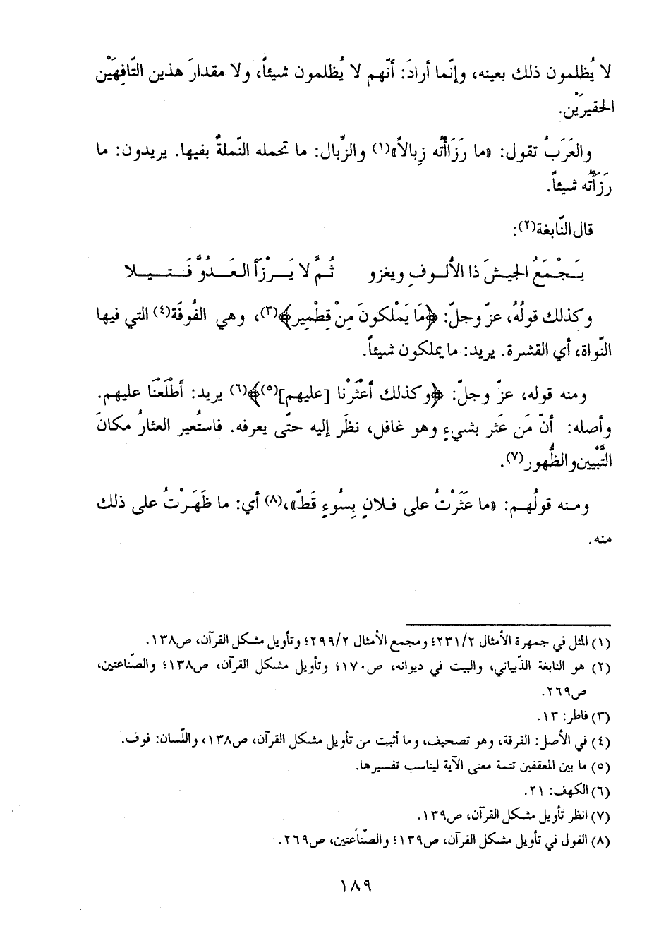 وكذلك قوله، عز وجل: {مَا يَمْلِكُونَ مِنْ قِطْمِيرٍ}، وهي الفُوفَة التي فيها النواة، أي القشرة. يريد: ما يملكون شيئاً.