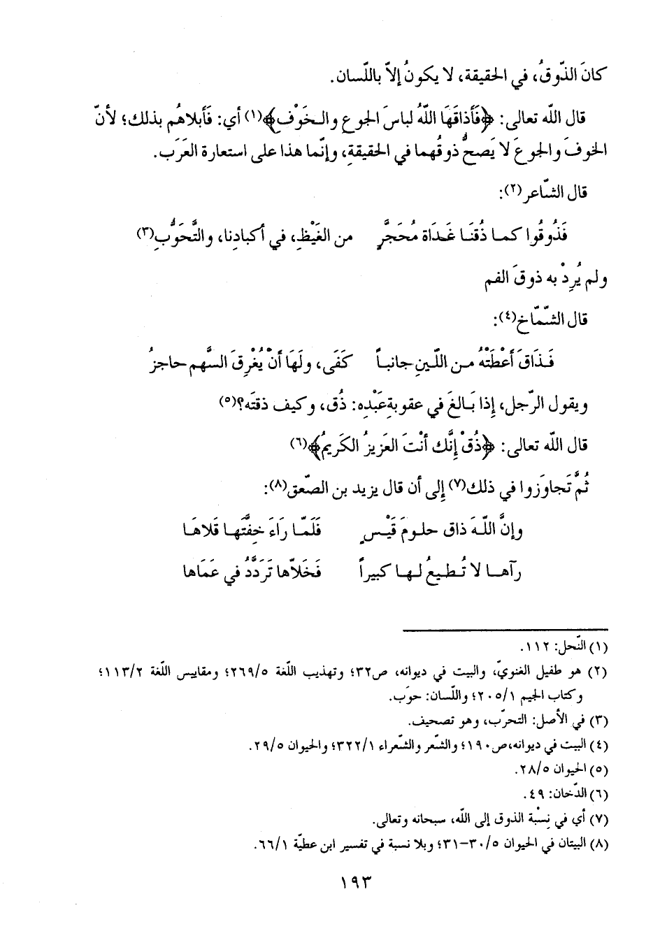 قال الله تعالى: {فَأَذَاقَهَا اللَّهُ لِبَاسَ الْجُوعِ وَالْخَوْفِ} أي: فأبلاهم بذلك؛ لأن الخوف والجوع لا يصح ذوقهما في الحقيقة، وإنما هذا على استعارة العرب.