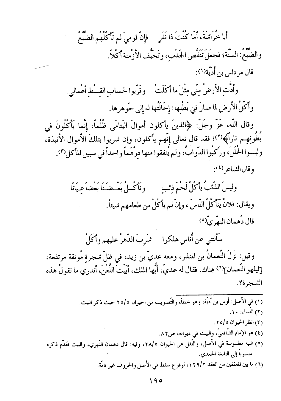 وقيل: نزل النعمان بن المنذر، ومعه عدي بن زيد، في ظل شجرة مونقة مرتفعة، [ليلهو النعمان] هناك. فقال له عدي، أيها الملك، أبيت اللعن، أتدري ما تقول هذه الشجرة؟.