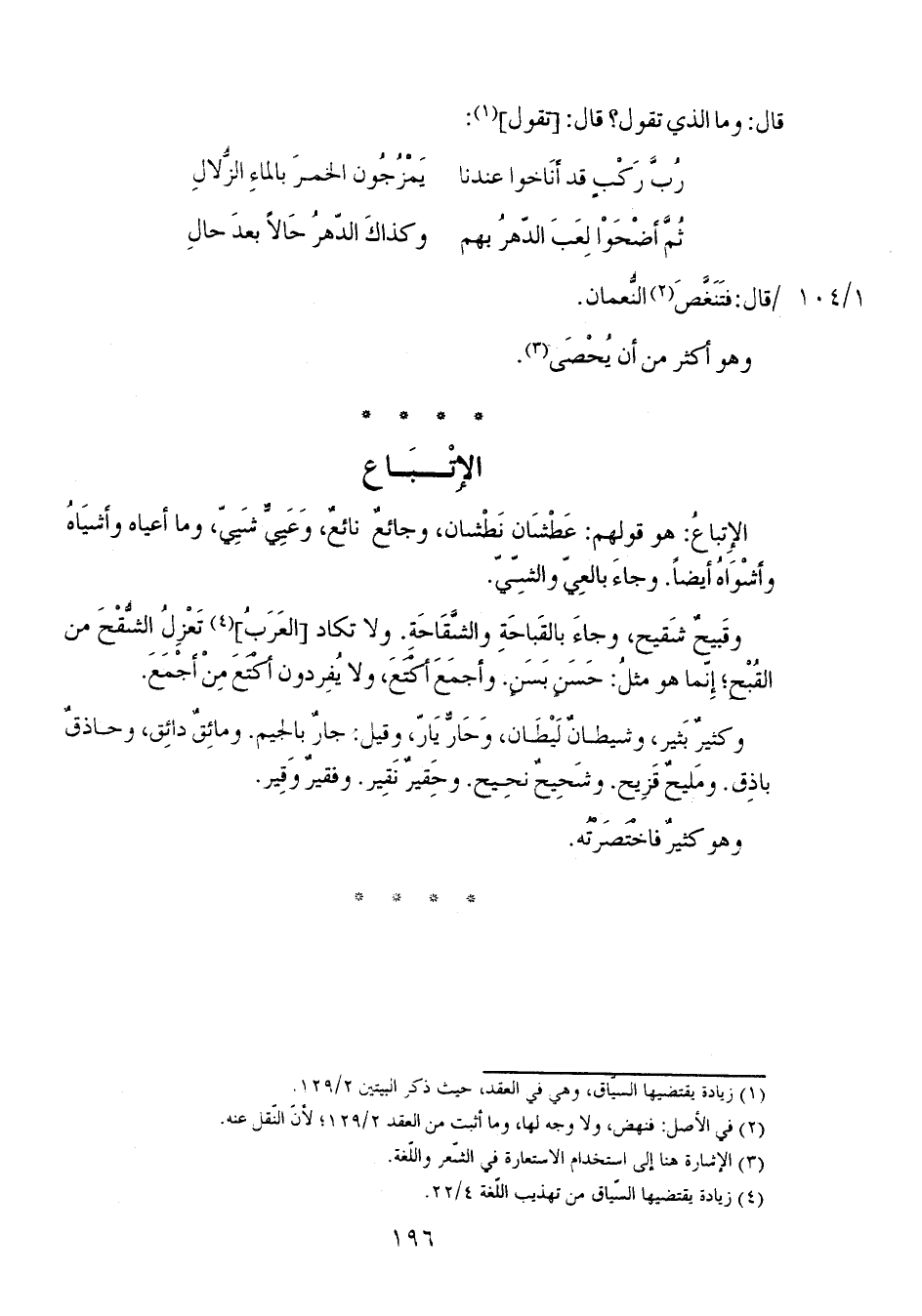 الإتباع: هو قولهم: عطشان نطشان، وجائع نائع، وعيي شيي، وما أعياه وأشياه وأشواه أيضاً. وجاء بالعي والشي.