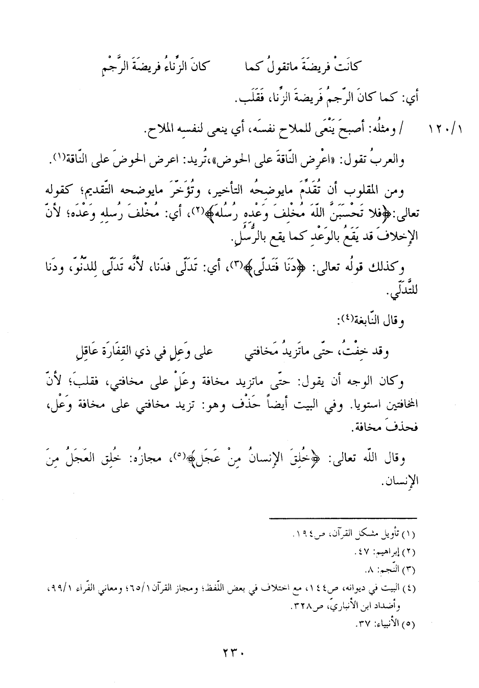 ومن المقلوب أن تقدم ما يوضحه التأخير، وتؤخذ ما يوضحه التقديم؛ كقوله تعالى: {فَلا تَحْسَبَنَّ اللَّهَ مُخْلِفَ وَعْدِهِ رُسُلَهُ}، أي: مخلف رسله وعده؛ لأن الإخلاف قد يقع بالوعد كما يقع بالرسل.