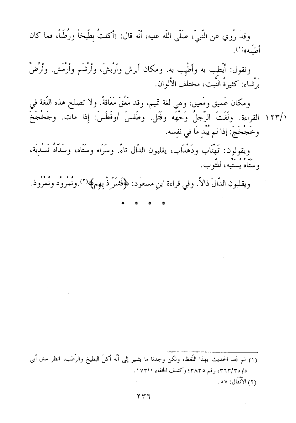ومكان عميق ومعيق، وهي لغة تميم، وقد معُقَ معاقة. ولا تصلح هذه اللغة في القراءة. ولفت الرجل وجهه وفتل. طفس وفطس: إذا مات. وجخجخ وخجخج: إذا لم يُبد ما في نفسه.