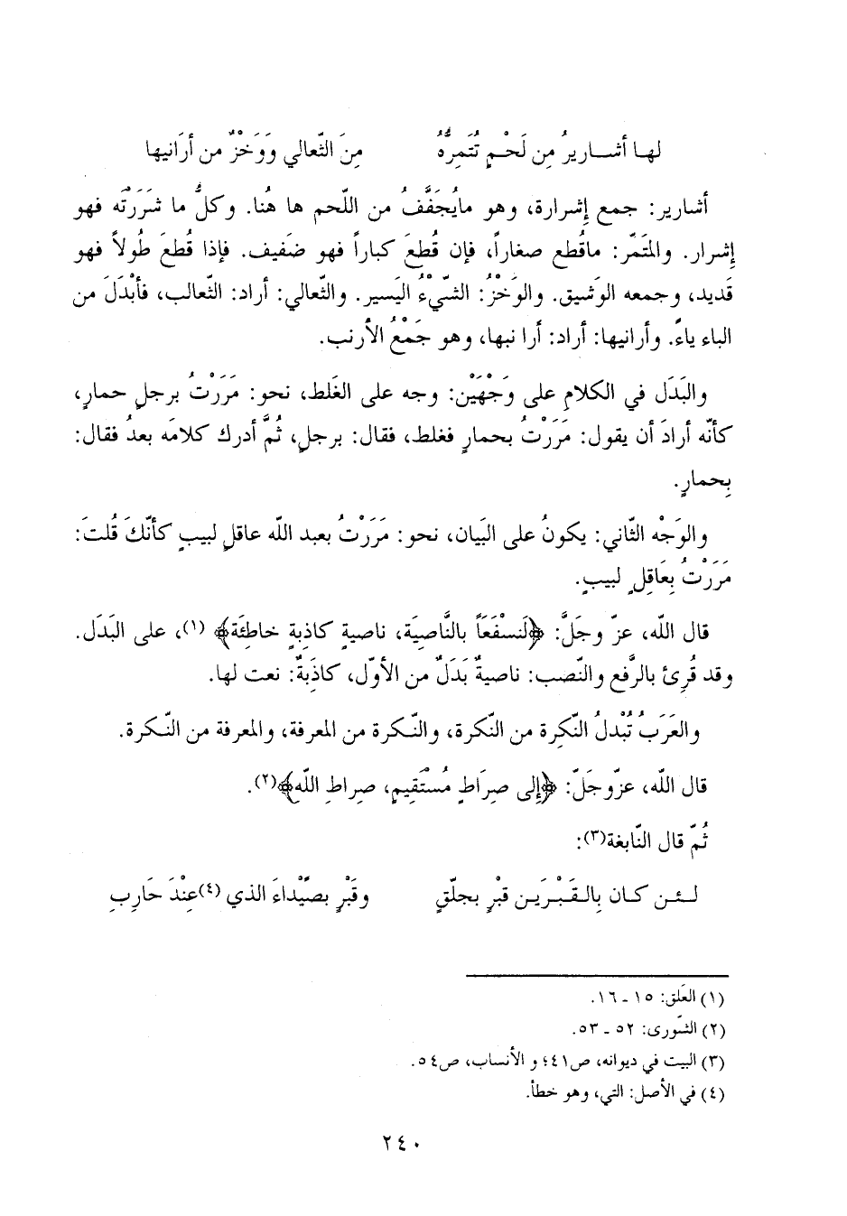 قال الله، عز وجل: {لَنَسْفَعَاً بِالنَّاصِيَةِ، نَاصِيَةٍ كَاذِبَةٍ خَاطِئَةٍ}، على البدل. وقد قرئ بالرفع والنصب: ناصيةٌ بدل من الأول، كاذبةٌ: نعت لها.