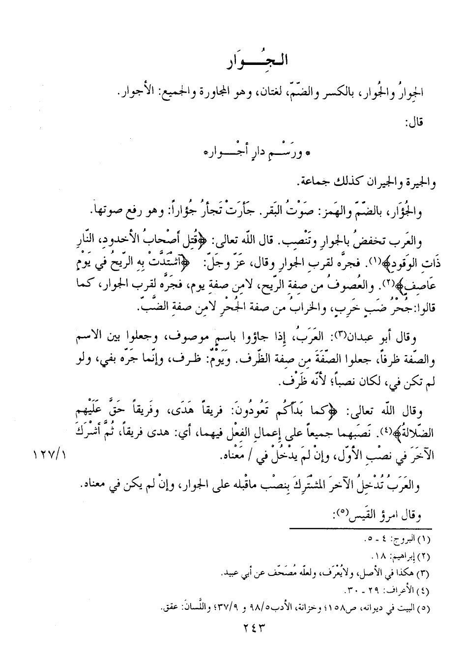 والعرب تخفض بالجوار وتنصب. قال الله تعالى: {قُتِلَ أَصْحَابُ الأُخْدُودِ، النَّارِ ذَاتِ الْوَقُودِ}. فجرَّه لقرب الجوار وقال، عز وجل: {اشْتَدَّتْ بِهِ الرِّيحُ فِي يَوْمٍ عَاصِفٍ}. والعُصوف من صفة الريح، لا من صفة يوم، فجرَّه لقرب الجوار، كما قالوا: جحر ضب خرب، والخراب من صفة الجُحر لا من صفة الضب.
