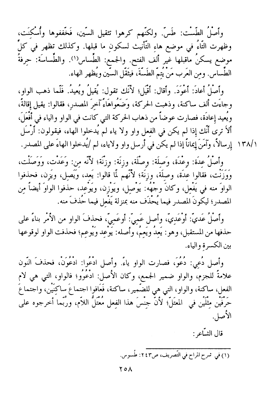 وأصل عِدَة: وِعْدَة، وصِلَة: وِصْلَة، وزِنَة: وزنة؛ لأنه من: وعدت، ووصلت، ووزنت، فقالوا عدة، وصلة، وزنة؛ لأنهم لما قالوا: يعد، ويصل، ويزن، فحذفوا الواو منه في يفعل، وكان وجهه: يوصل، ويوزن، ويوعد، حذفوا الواو أيضاً من المصدر؛ ليكون المصدر فيما يحذف منه بمنزلة يفعل فيما حذف منه.