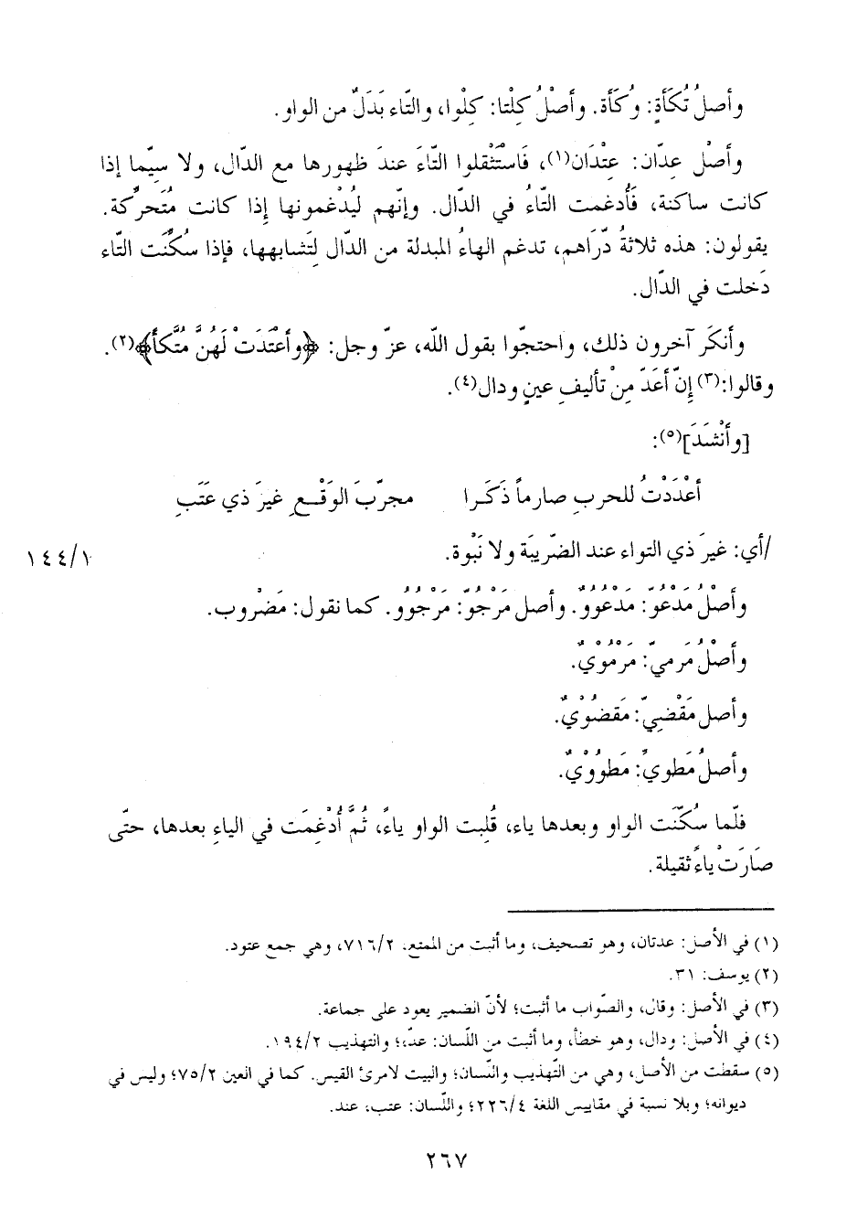 وأصل عدان: عِتْدان، فاستثقلوا التاء عند ظهورها مع الدال، ولاسيما إذا كانت ساكنة، فأدغمت التاء في الدال. وإنهم ليدغمونها إذا كانت متحركة. يقولون: هذه ثلاثة دراهم، تدغم الهاء المبدلة من الدال لتشابهها، فإذا سكنت التاء دخلت في الدال.
