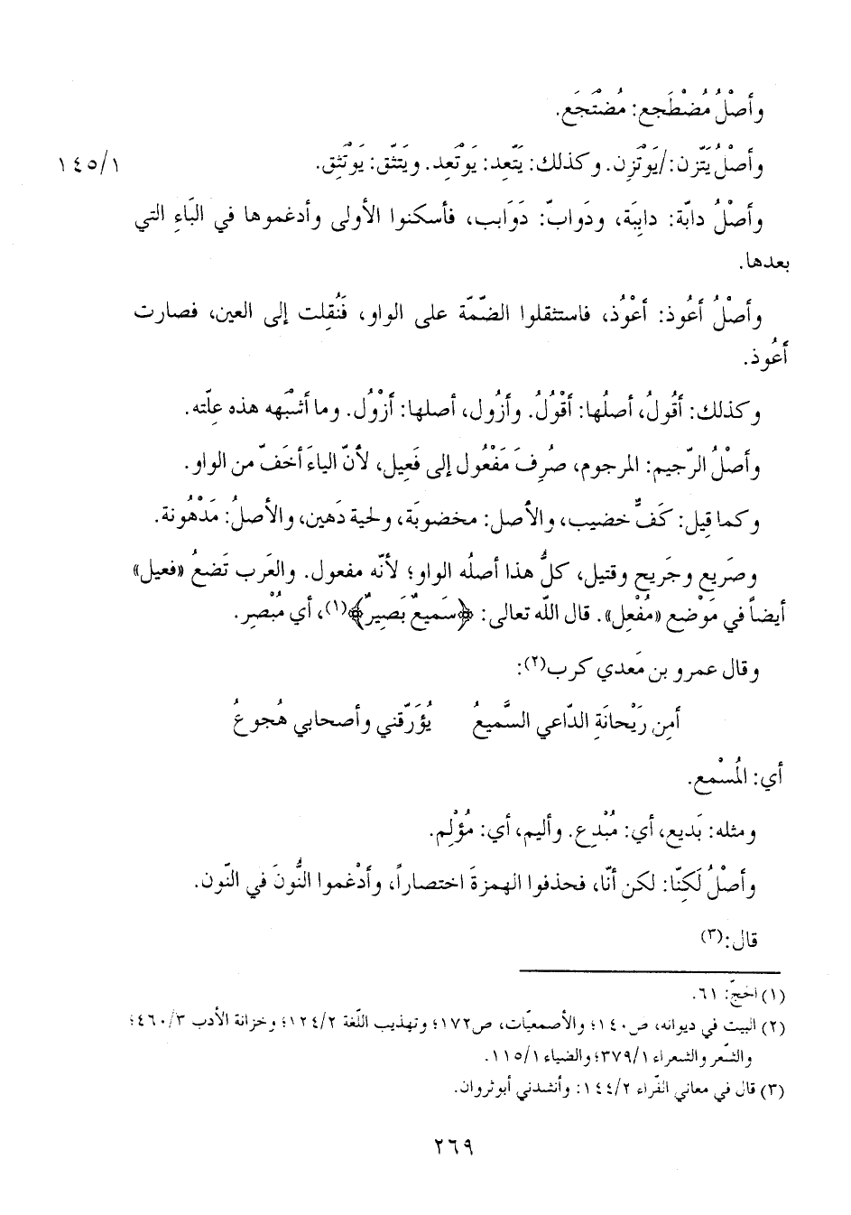 وصريع وجريح وقتيل، كل هذا أصله الواو؛ لأنه مفعول. والعرب تضع "فعيل" أيضاً في موضع "مُفْعِل". قال الله تعالى: {سَمِيعٌ بَصِيرٌ}، أي مُبصر.