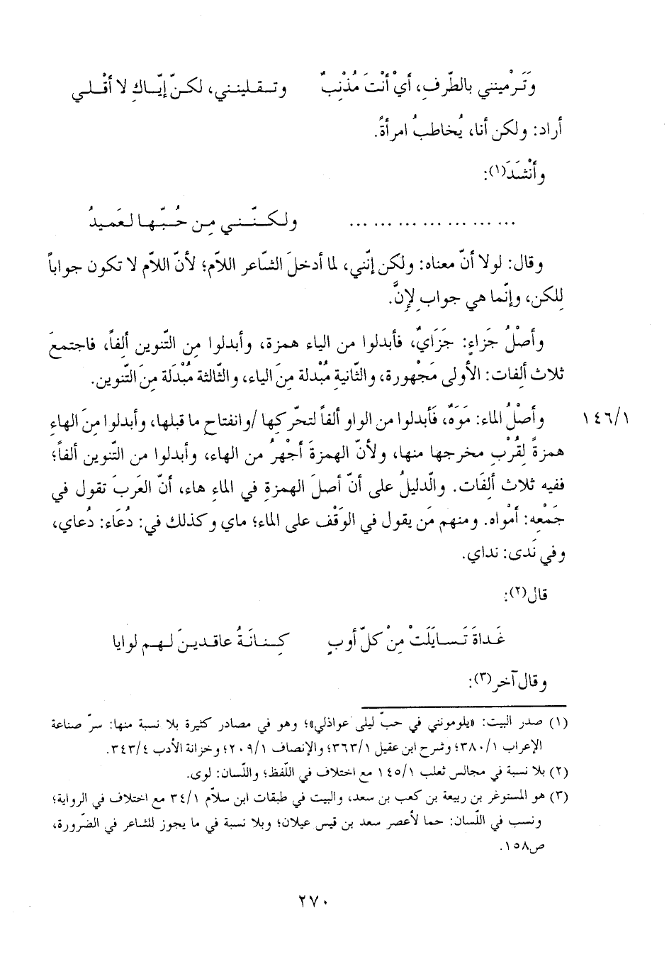 وأصل الماء: موه، فأبدلوا من الواو ألفاً لتحركها وانفتاح ما قبلها، وأبدلوا من الهاء همزة لقرب مخرجها منها، ولأن الهمزة أجهر من الهاء، وأبدلوا من التنوين ألفاً؛ ففيه ثلاث ألفات. والدليل على أن أصل الهمزة في الماء هاء، أن العرب تقول في جمعه: أمواه. ومنهم من يقول في الوقف على الماء؛ ماي وكذلك في: دعاء: دعاي، وفي ندى: نداي.