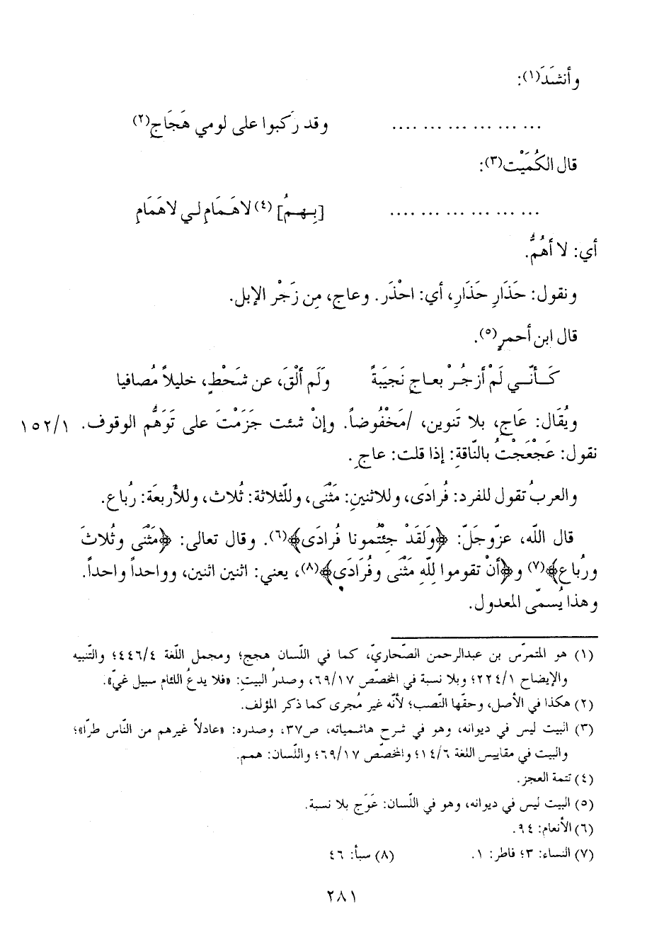 قال الله، عز وجل: {وَلَقَدْ جِئْتُمُونَا فُرَادَى}. وقال تعالى: {مَثْنَى وَثُلاثَ وَرُبَاعَ} و {أَنْ تَقُومُوا لِلَّهِ مَثْنَى وَفُرَادَى}، يعني: اثنين اثنين، وواحداً واحداً. وهذا يسمى المعدول.