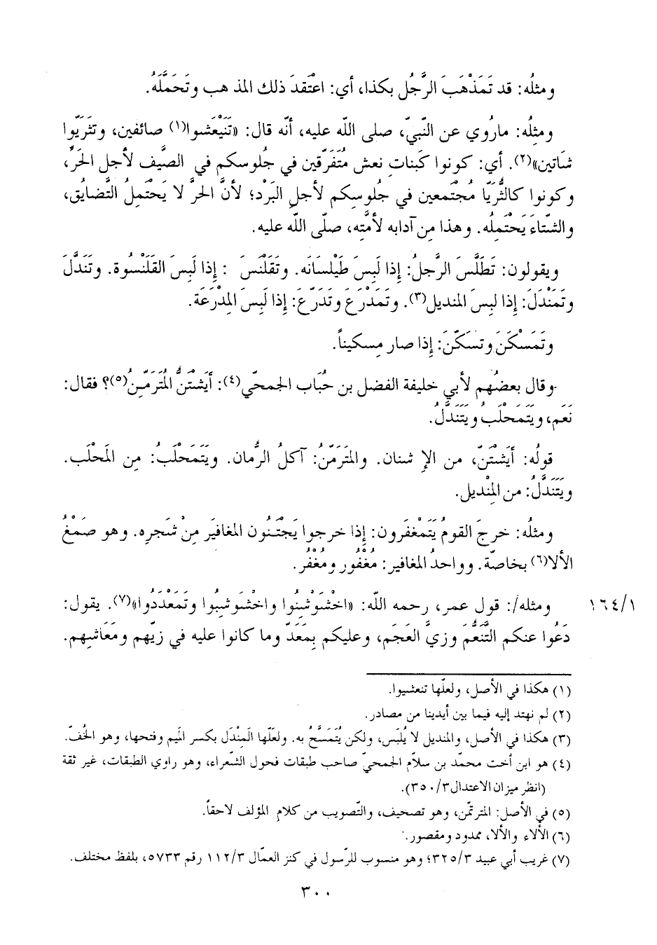ومثله: قول عمر، رحمه الله: "اخشوشِنُوا واخشوشِبوا وتمعددوا". يقول: دعوا عنكم التنعُّم وزي العجم، وعليكم بمعدّ وما كانوا عليه في زيهم ومعاشهم.