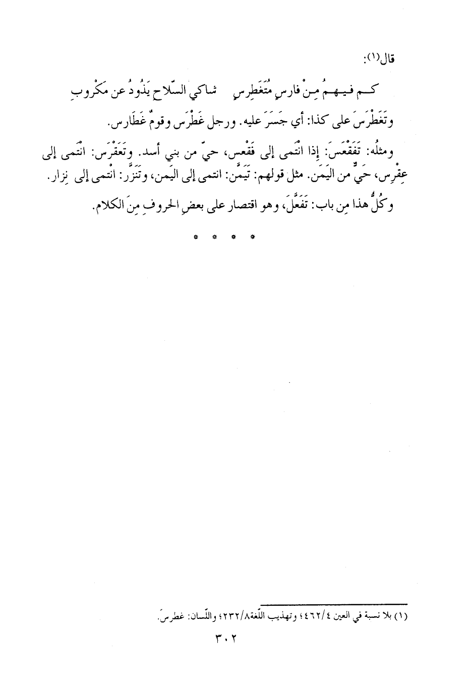 ومثله: تفقعس: إذا انتمى إلى فقعس، حي من بني أسد. وتعقرس: انتمى إلى عقرس، حي من اليمن. مثل قولهم: تيمَّن: انتمى إلى اليمن، وتنزَّر: انتمى إلى نزار.