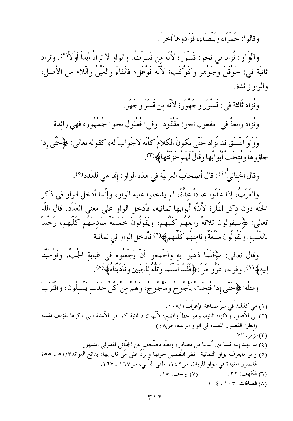 والعرب، إذا عدوا عدداً عدَّة، لم يدخلوا عليه الواو، وإنما أدخل الواو في ذكر الجنة دون ذكر النار؛ لأن؛ أبوابها ثمانية، فأدخل الواو على معنى العدد. قال الله تعالى: {سَيَقُولُونَ ثَلاثَةٌ رَابِعُهُمْ كَلْبُهُمْ وَيَقُولُونَ خَمْسَةٌ سَادِسُهُمْ كَلْبُهُمْ رَجْماً بِالْغَيْبِ وَيَقُولُونَ سَبْعَةٌ وَثَامِنُهُمْ كَلْبُهُمْ} فأدخل الواو في ثمانية.