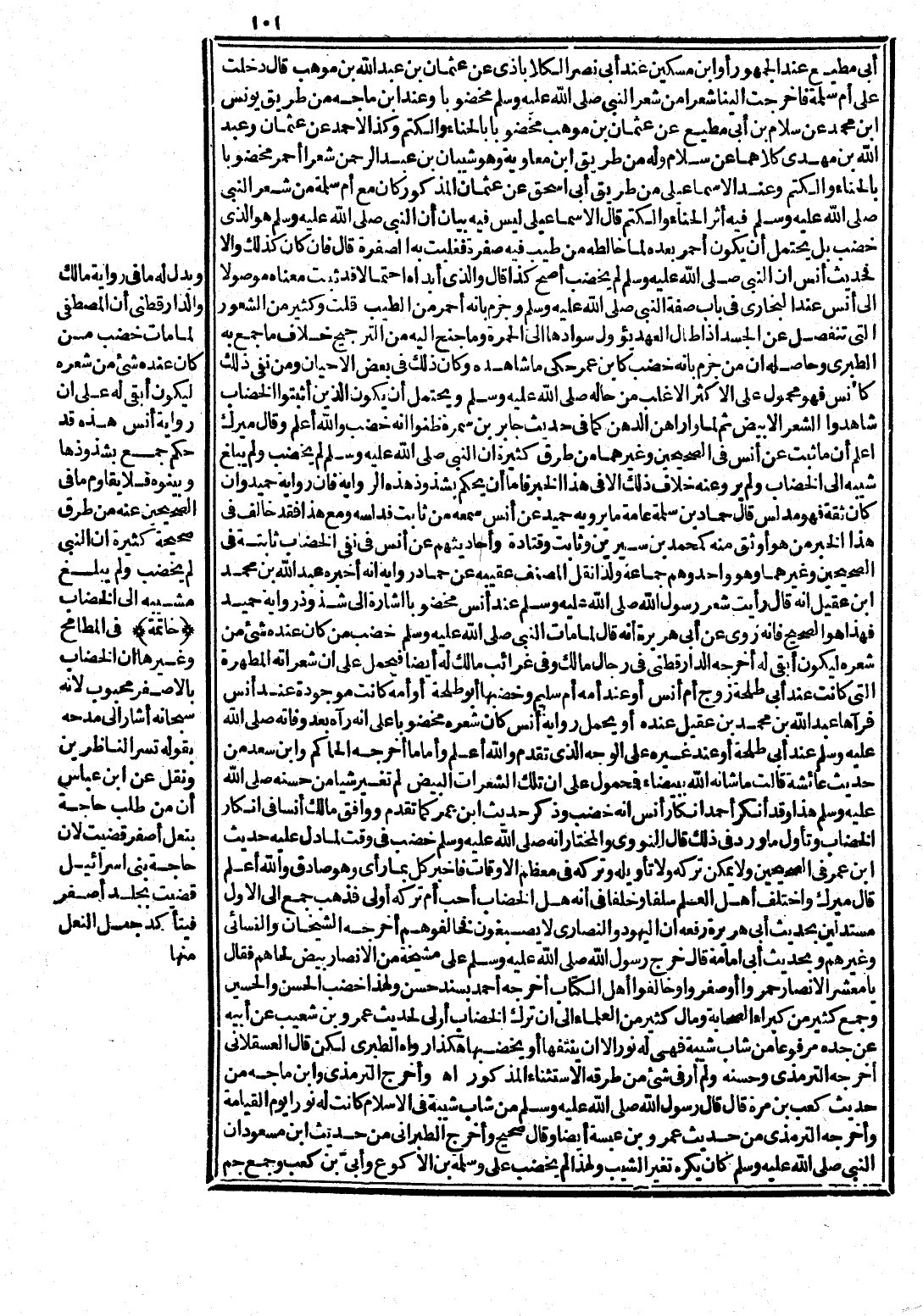 سَمِعَهُ مِنْ ثَابِتٍ فَدَلَّسَهُ. وَمَعَ هَذَا فَقَدَ خَالَفَ فِي هَذَا الْخَبَرِ مَنْ هُوَ أَوْثَقُ مِنْهُ كَمُحَمَّدِ بْنِ سِيرِينَ وَثَابِتٍ وَقَتَادَةَ، وَأَحَادِيثُهُمْ عَنْ أَنَسٍ فِي نَفْيِ الْخِضَابِ ثَابِتَةٌ فِي الصَّحِيحَيْنِ وَغَيْرِهِمَا، وَهُوَ وَاحِدٌ وَهُمْ جَمَاعَةٌ وَلِذَا نَقَلَ الْمُصَنِّفُ عَقِيبَهُ عَنْ حَمَّادٍ رَاوِيهِ أَنَّهُ أَخْبَرَهُ عَبْدُ اللَّهِ بْنُ مُحَمَّدِ بْنِ عَقِيلٍ أَنَّهُ قَالَ: رَأَيْتُ شَعْرَ رَسُولِ اللَّهِ صَلَّى اللَّهُ عَلَيْهِ وَسَلَّمَ عِنْدَ أَنَسٍ مَخْضُوبًا. إِشَارَةً إِلَى شُذُوذِ رِوَايَةِ حُمَيْدٍ فَهَذَا هُوَ الصَّحِيحُ فَإِنَّهُ رَوَى عَنْ أَبِي هُرَيْرَةَ أَنَّهُ قَالَ: لَمَّا مَاتَ النَّبِيُّ صَلَّى اللَّهُ عَلَيْهِ وَسَلَّمَ خَضَبَ مَنْ كَانَ عِنْدَهُ شَيْءٌ مِنْ شَعْرِهِ لِيَكُونَ أَبْقَى لَهُ. أَخْرَجَهُ الدَّارَقُطْنِيُّ فِي رِجَالِ مَالِكٍ، وَفِي غَرَائِبِ مَالِكٍ لَهُ أَيْضًا فَيُحْمَلُ عَلَى أَنَّ شَعَرَاتِهِ الْمُطَهَّرَةَ الَّتِي كَانَتْ عِنْدَ أَبِي طَلْحَةِ زَوْجِ أُمِّ أَنَسٍ أَوْ عِنْدَ أُمِّهِ أُمِّ سُلَيْمٍ وَخَضَبَهَا أَبُو طَلْحَةَ أَوْ أُمُّهُ كَانَتْ مَوْجُودَةً عِنْدَ أَنَسٍ فَرَآهَا عَبْدُ اللَّهِ بْنُ مُحَمَّدِ بْنِ عَقِيلٍ عِنْدَهُ، أَوْ يُحْمَلُ رِوَايَةُ أَنَسٍ " كَانَ شَعْرُهُ مَخْضُوبًا "، عَلَى أَنَّهُ رَآهُ بَعْدَ وَفَاتِهِ صَلَّى اللَّهُ عَلَيْهِ وَسَلَّمَ عِنْدَ أَبِي طَلْحَةَ أَوْ عِنْدَ غَيْرِهِ عَلَى الْوَجْهِ الَّذِي تَقَدَّمَ، وَاللَّهُ أَعْلَمُ، وَأَمَّا مَا أَخْرَجَهُ الْحَاكِمُ وَابْنُ سَعْدٍ مِنْ حَدِيثِ عَائِشَةَ قَالَتْ: مَا شَانَهُ اللَّهُ بِبَيْضَاءَ. فَمَحْمُولٌ عَلَى أَنَّ تِلْكَ الشَّعَرَاتِ الْبِيضِ لَمْ تُغَيِّرْ شَيْئًا مِنْ حُسْنِهِ صَلَّى اللَّهُ عَلَيْهِ وَسَلَّمَ، هَذَا وَقَدْ أَنْكَرَ أَحْمَدُ إِنْكَارَ أَنَسٍ أَنَّهُ خَضَبَ، وَذَكَرَ حَدِيثَ ابْنِ عُمَرَ كَمَا تَقَدَّمَ، وَوَافَقَ مَالِكٌ أَنَسًا فِي إِنْكَارِ الْخِضَابِ وَتَأَوَّلَ مَا وَرَدَ فِي ذَلِكَ، قَالَ النَّوَوِيُّ: وَالْمُخْتَارُ أَنَّهُ صَلَّى اللَّهُ عَلَيْهِ وَسَلَّمَ خَضَبَ فِي وَقْتٍ لِمَا دَلَّ عَلَيْهِ حَدِيثُ ابْنُ عُمَرَ فِي الصَّحِيحَيْنِ وَلَا يُمْكِنُ تَرْكُهُ وَلَا تَأْوِيلُهُ، وَتَرَكَهُ فِي مُعْظَمِ الْأَوْقَاتِ، فَأَخْبَرَ كُلٌّ مَا رَأَى وَهُوَ صَادِقٌ، وَاللَّهُ أَعْلَمُ، قَالَ مِيرَكُ: وَاخْتَلَفَ أَهْلُ الْعِلْمِ سَلَفًا وَخَلَفًا فِي أَنَّهُ هَلِ الْخِضَابُ أَحَبُّ أَمْ تَرْكُهُ أَوْلَى؟ فَذَهَبَ جَمْعٌ إِلَى الْأَوَّلِ مُسْتَدِلِّينَ بِحَدِيثِ أَبِي هُرَيْرَةَ رَفَعَهُ: " إِنَّ الْيَهُودَ وَالنَّصَارَى لَا يَصْبُغُونَ فَخَالِفُوهُمْ ". أَخْرَجَهُ الشَّيْخَانِ وَالنَّسَائِيُّ وَغَيْرُهُمْ وَبِحَدِيثِ أَبِي أُمَامَةَ قَالَ: خَرَجَ رَسُولُ اللَّهِ صَلَّى اللَّهُ عَلَيْهِ وَسَلَّمَ عَلَى مَشْيَخَةٍ مِنَ الْأَنْصَارِ بِيضٌ لِحَاهُمْ فَقَالَ: " يَا مَعْشَرَ الْأَنْصَارِ حَمِّرُوا أَوْ صَفِّرُوا وَخَالِفُوا أَهْلَ الْكِتَابِ ". أَخْرَجَهُ أَحْمَدُ بِسَنَدٍ حَسَنٍ ; وَلِهَذَا خَضَبَ الْحَسَنُ وَالْحُسَيْنُ وَجَمْعٌ كَثِيرٌ مِنْ كُبَرَاءِ الصَّحَابَةِ، وَمَالَ كَثِيرٌ مِنَ الْعُلَمَاءِ إِلَى أَنَّ تَرْكَ الْخِضَابِ أَوْلَى لِحَدِيثِ عَمْرِو بْنِ شُعَيْبٍ عَنْ أَبِيهِ عَنْ جَدِّهِ مَرْفُوعًا: " مَنْ شَابَ شَيْبَةً فَهِيَ لَهُ نُورٌ إِلَّا أَنْ يَنْتِفَهَا أَوْ يَخْضِبَهَا ". هَكَذَا رَوَاهُ الطَّبَرِيُّ، لَكِنْ قَالَ الْعَسْقَلَانِيُّ: أَخْرَجَهُ التِّرْمِذِيُّ وَحَسَّنَهُ، لَمْ أَرَ فِي شَيْءٍ مِنْ طُرُقِهِ الِاسْتِثْنَاءَ الْمَذْكُورَ، انْتَهَى. وَأَخْرَجَ التِّر