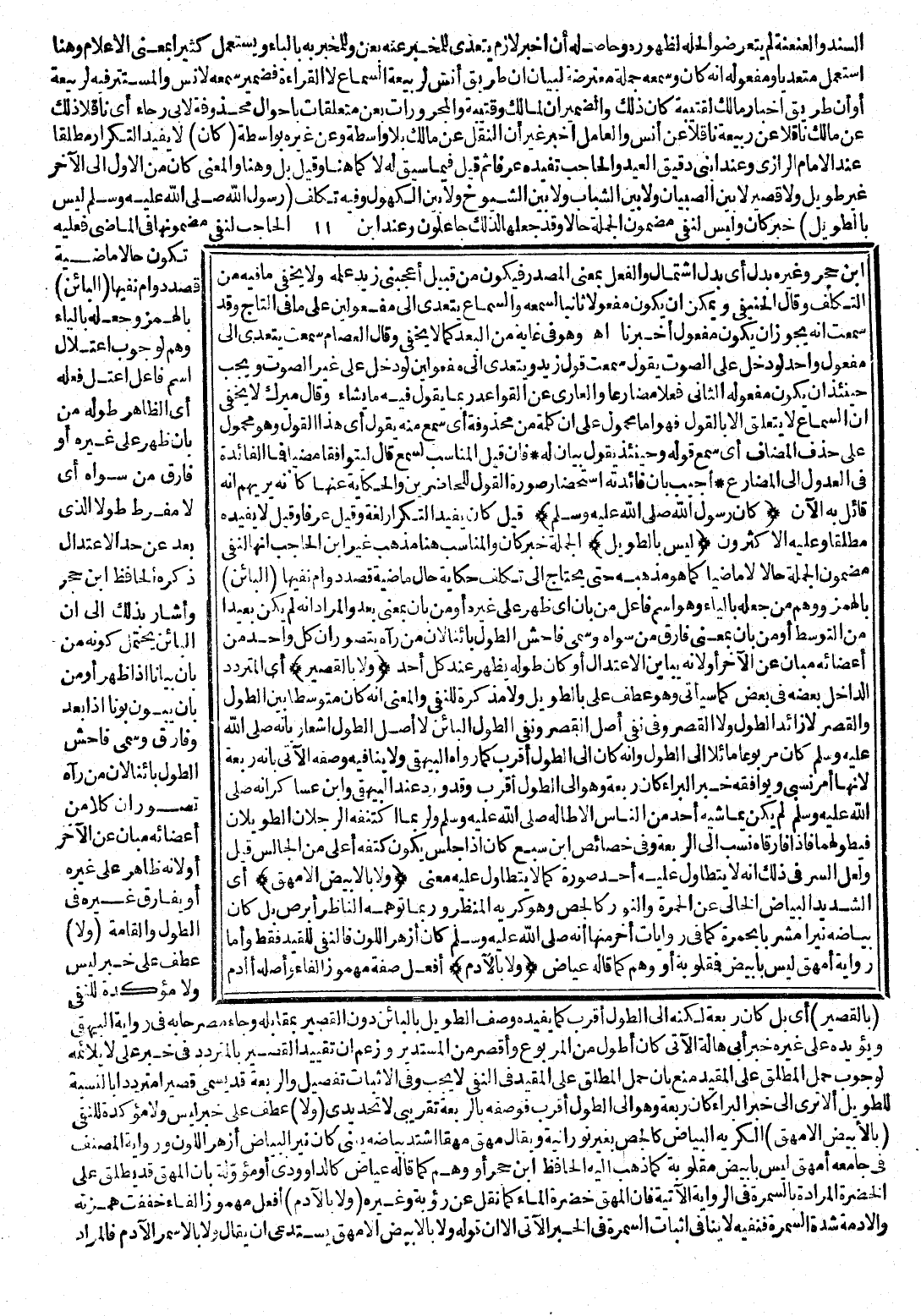 (وَلَا بِالْقَصِيرِ) : أَيِ الْمُتَرَدِّدِ الدَّاخِلِ بَعْضُهُ فِي بَعْضٍ كَمَا سَيَأْتِي، وَهُوَ عَطْفٌ عَلَى بِالطَّوِيلِ وَلَا مُذَكِّرَةٌ لِلنَّفْيِ وَالْمَعْنَى أَنَّهُ كَانَ مُتَوَسِّطًا بَيْنَ الطُّولِ وَالْقِصَرِ لَا زَائِدَ الطُّولِ وَلَا الْقِصَرِ، وَفِي نَفْيِ أَصْلِ الْقِصَرِ وَنَفْيِ الطُّولِ الْبَائِنِ لَا أَصْلِ الطُّولِ إِشْعَارٌ بِأَنَّهُ صَلَّى اللَّهُ عَلَيْهِ وَسَلَّمَ كَانَ مَرْبُوعًا مَائِلًا إِلَى الطُّولِ وَأَنَّهُ كَانَ إِلَى الطُّولِ أَقْرَبُ كَمَا رَوَاهُ الْبَيْهَقِيُّ، وَلَا يُنَافِيهِ وَصْفُهُ الْآتِي بِأَنَّهُ رَبْعَةٌ لِأَنَّهَا أَمْرٌ نِسْبِيٌّ وَيُوَافِقُهُ خَبَرُ الْبَرَاءِ كَانَ رَبْعَةً وَهُوَ إِلَى الطُّولِ أَقْرَبُ، وَقَدْ وَرَدَ عِنْدَ الْبَيْهَقِيِّ وَابْنِ عَسَاكِرَ أَنَّهُ صَلَّى اللَّهُ عَلَيْهِ وَسَلَّمَ لَمْ يَكُنْ يُمَاشِيهِ أَحَدٌ مِنَ النَّاسِ إِلَّا طَالَهُ صَلَّى اللَّهُ عَلَيْهِ وَسَلَّمَ وَلَرُبَّمَا اكْتَنَفَهُ الرَّجُلَانِ الطَّوِيلَانِ فَيَطُولُهُمَا فَإِذَا فَارَقَاهُ نُسِبَ إِلَى الرَّبْعَةِ، وَفِي خَصَائِصِ ابْنِ سَبْعٍ كَانَ إِذَا جَلَسَ يَكُونُ كَتِفُهُ أَعْلَى مِنَ الْجَالِسِ، قِيلَ وَلَعَلَّ السِّرَّ فِي ذَلِكَ أَنَّهُ لَا يَتَطَاوَلُ عَلَيْهِ أَحَدٌ صُورَةً كَمَا لَا يَتَطَاوَلُ عَلَيْهِ مَعْنًى.