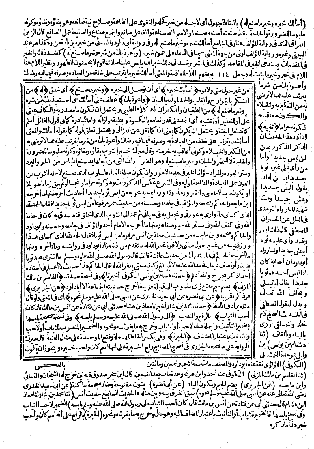(حَدَّثَنَا هِشَامُ بْنُ يُونُسَ الْكُوفِيُّ، أَخْبَرَنَا) : وَفِي نُسْخَةٍ «حَدَّثَنَا» . (الْقَاسِمُ بْنُ مَالِكٍ الْمُزَنِيُّ) : بِضَمِّ مِيمٍ فَفَتْحِ زَايٍ، مَنْسُوبٌ إِلَى قَبِيلَةِ مُزَيْنَةَ، أَخْرَجَ حَدِيثَهُ الْجَمَاعَةُ إِلَّا أَبَا دَاوُدَ. (عَنِ الْجُرَيْرِيِّ) : مَرَّ ذِكْرُهُ قَرِيبًا. (عَنْ أَبِي نَضْرَةَ، عَنْ أَبِي سَعِيدٍ الْخُدْرِيِّ، عَنِ النَّبِيِّ صَلَّى اللَّهُ عَلَيْهِ وَسَلَّمَ نَحْوَهُ) : أَيْ فِي الْمَعْنَى، وَلَوْ قَالَ (مِثْلَهُ) يُرَادُ فِي اللَّفْظِ.
