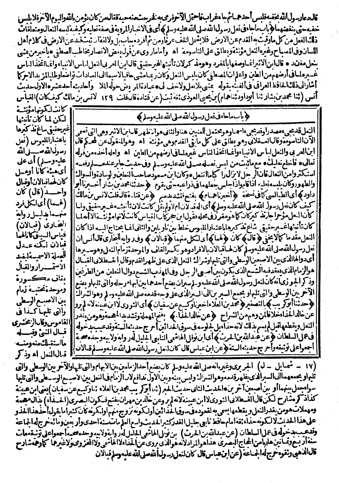 (عَنْ قَتَادَةَ قَالَ: قُلْتُ لِأَنَسِ بْنِ مَالِكٍ: كَيْفَ كَانَ نَعْلُ رَسُولِ اللَّهِ صَلَّى اللَّهُ عَلَيْهِ وَسَلَّمَ؟) : أَيْ أَلَهُ قِبَالَانِ أَمْ لَا؟ وَلَمْ يَقِلْ «كَانَتْ» ; لِأَنَّ تَأْنِيثَهُ غَيْرُ حَقِيقِيٍّ، وَلَمَّا كَانَ النَّعْلُ مُؤَخَّرًا جَازَ تَذْكِيرُ «كَانَ» كَمَا هُوَ مُقَرَّرٌ فِي مَحَلِّهِ، فَقَوْلُ ابْنِ حَجَرٍ كَانَ الْقِيَاسُ «كَانَتْ» لِأَنَّهَا مُؤَنَّثَةٌ إِلَّا أَنَّهُ لَمَّا كَانَ تَأْنِيثُهَا غَيْرُ حَقِيقِيٍّ شَاعَ تَذْكِيرُهَا بِاعْتِبَارِ الْمَلْبُوسِ خَلَطَ بَيْنَ تَأْوِيلَيْنِ، وَالثَّانِي إِنَّمَا يُحْتَاجُ إِلَيْهِ إِذَا كَانَ النَّعْلُ مُقَدَّمًا كَمَا لَا يَخْفَى. (قَالَ) : كَانَ. (لَهُمَا) : أَيْ لِكُلٍّ مِنْهُمَا. (قِبَالَانِ) : وَفِي رِوَايَةٍ لِلْبُخَارِيِّ: قَالَ أَنَسٌ: إِنَّ نَعْلَ رَسُولِ اللَّهِ صَلَّى اللَّهُ عَلَيْهِ وَسَلَّمَ كَانَ لَهَا قِبَالَانِ. بِالْإِفْرَادِ، وَهُوَ بِكَسْرِ الْقَافِ وَالْمُوَحَّدَةِ زِمَامُ النَّعْلِ، وَهُوَ سَيْرُهَا أَيْ دَوَالُهَا الَّذِي بَيْنَ الْإِصْبَعَيْنِ الْوُسْطَى وَالَّتِي تَلِيهَا، وَشِرَاكُ النَّعْلِ الَّذِي عَلَى ظَهْرِ الْقَدَمِ، وَقَالَ الْعَسْقَلَانِيُّ: الْقِبَالُ هُوَ الزِّمَامُ الَّذِي يُعْقَدُ فِيهِ الشِّسْعُ الَّذِي يَكُونُ بَيْنَ إِصْبَعَيِ الرِّجْلِ. وَفِي الْمُهَذَّبِ: الشِّسْعُ دَوَالُ النَّعْلَيْنِ مِنَ الطَّرَفَيْنِ. وَذَكَرَ الْجَزَرِيُّ أَنَّهُ كَانَ لِنَعْلِ رَسُولُ اللَّهِ صَلَّى اللَّهُ عَلَيْهِ وَسَلَّمَ سَيْرَانِ يَضَعُ أَحَدُهُمَا بَيْنَ إِبْهَامِ رِجْلِهِ وَالَّتِي تَلِيهَا وَيَضَعُ الْآخَرَ بَيْنَ الْوُسْطَى وَالَّتِي تَلِيهَا وَيَجْمَعُ السَّيْرَيْنِ إِلَى السَّيْرِ الَّذِي عَلَى وَجْهِ قَدَمِهِ صَلَّى اللَّهُ عَلَيْهِ وَسَلَّمَ وَهُوَ الشِّرَاكُ. (يُحَدِّثُنَا أَبُو كُرَيْبٍ) : بِالتَّصْغِيرِ. (مُحَمَّدُ بْنُ الْعَلَاءِ، أَخْبَرَنَا وَكِيعٌ عَنْ سُفْيَانَ) : أَيِ الثَّوْرِيِّ لَا ابْنِ عُيَيْنَةَ لِأَنَّهُ لَمْ يَرْوِ عَنْ خَالِدٍ الْحَذَّاءِ خِلَافًا لِمَنْ وَهِمَ مِنَ الشُّرَّاحِ. (عَنْ خَالِدٍ الْحَذَّاءِ) : بِفَتْحِ الْمُهْمَلَةِ وَتَشْدِيدِ الْمُعْجَمَةِ، وَهُوَ مَنْ يُقَدِّرُ النَّعْلَ وَيَقْطَعُهَا، قِيلَ: لَمْ يُسَمَّ بِذَلِكَ لِأَنَّهُ حَذَّاءٌ بَلْ لِجُلُوسِهِ فِي سُوقِ الْحَذَّائِينَ، أَخْرَجَ حَدِيثَهُ السِّتَّةُ، وَقَدْ عِيبَ بِدُخُولِهِ فِي عَمَلِ السُّلْطَانِ. (عَنْ عَبْدِ اللَّهِ بْنِ الْحَارِثِ) : أَيِ ابْنِ نَوْفَلٍ الْهَاشِمِيِّ التَّابِعِيِّ الْجَلِيلِ لَهُ رِوَايَةٌ، وَلِأَبِيهِ وَجَدِّهِ صُحْبَةٌ، أَجْمَعُوا عَلَى تَوْثِيقِهِ، وَأَخْرَجَ حَدِيثَهُ السِّتَّةُ. (عَنِ ابْنِ عَبَّاسٍ قَالَ: كَانَ لِنَعْلِ رَسُولِ اللَّهِ صَلَّى اللَّهُ عَلَيْهِ وَسَلَّمَ قِبَالَانِ