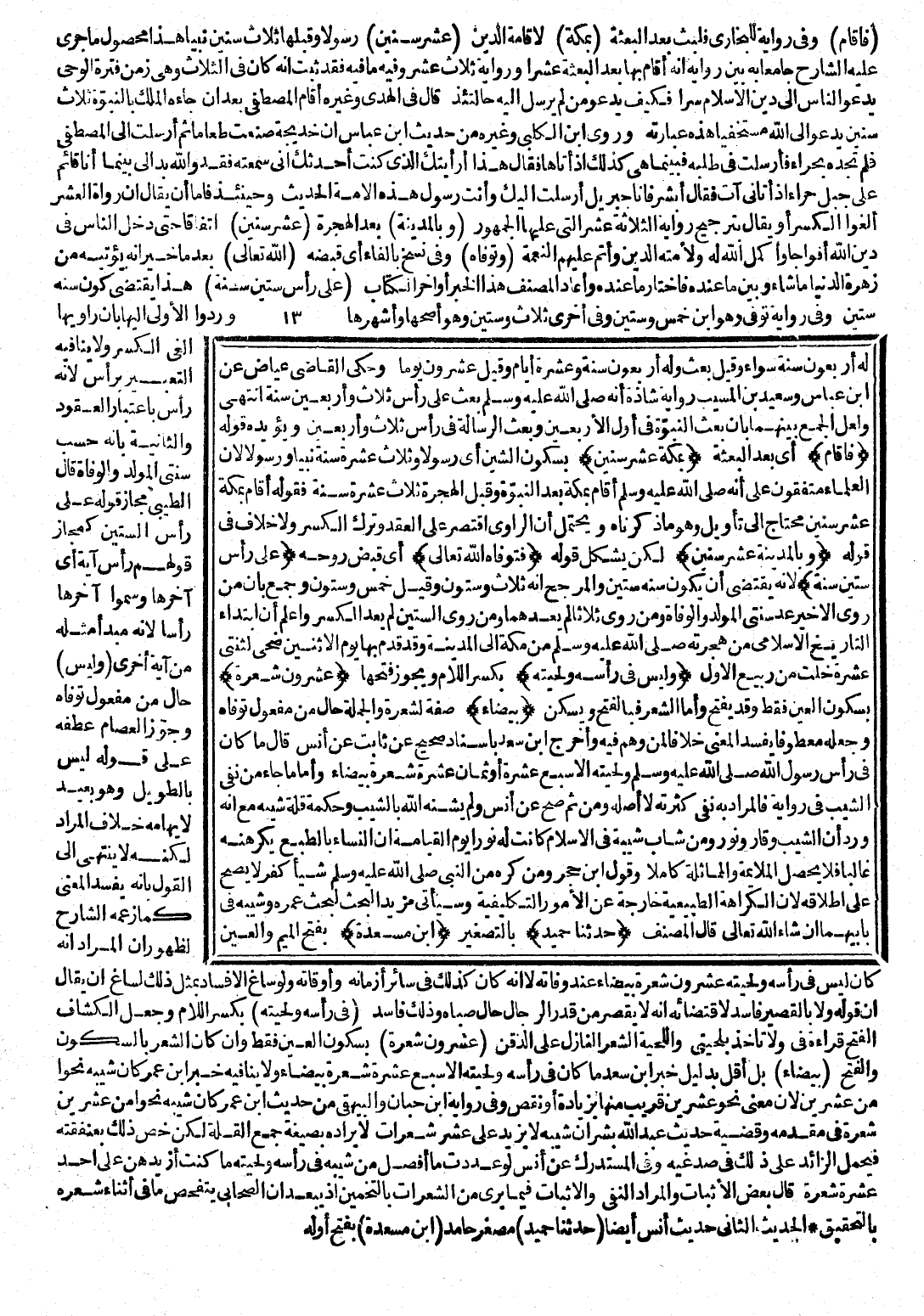 فِي رَأْسِ ثَلَاثٍ وَأَرْبَعِينَ، وَيُؤَيِّدُ قَوْلَهُ. (فَأَقَامَ) : أَيْ بَعْدَ الْبَعْثَةِ. (بِمَكَّةَ عَشْرَ سِنِينَ) : بِسُكُونِ الشِّينِ أَيْ رَسُولًا وَثَلَاثَ عَشْرَةَ سَنَةً نَبِيًّا وَرَسُولًا ; لِأَنَّ الْعُلَمَاءَ مُتَّفِقُونَ عَلَى أَنَّهُ صَلَّى اللَّهُ عَلَيْهِ وَسَلَّمَ أَقَامَ بِمَكَّةَ بَعْدَ النُّبُوَّةِ وَقَبْلَ الْهِجْرَةِ ثَلَاثَ عَشْرَةَ سَنَةً، فَقَوْلُهُ أَقَامَ بِمَكَّةَ عَشْرَ سِنِينَ مُحْتَاجٌ إِلَى تَأْوِيلٍ وَهُوَ مَا ذَكَرْنَاهُ، وَيُحْتَمَلُ أَنِ الرَّاوِيَ اقْتَصَرَ عَلَى الْعَقْدِ وَتَرَكَ الْكَسْرَ، وَلَا خِلَافَ فِي قَوْلِهِ (وَبِالْمَدِينَةِ عَشْرَ سِنِينَ) : لَكِنْ يَشْكُلُ قَوْلُهُ. (فَتَوَفَّاهُ اللَّهُ تَعَالَى) : أَيْ قَبَضَ رُوحَهُ. (عَلَى رَأْسِ سِتِّينَ سَنَةً) : لِأَنَّهُ يَقْتَضِي أَنْ يَكُونَ سِنُّهُ سِتِّينَ، وَالْمُرَجَّحُ أَنَّهُ ثَلَاثٌ وَسِتُّونَ وَقِيلَ خَمْسٌ وَسِتُّونَ وَجُمِعَ بِأَنَّ مَنْ رَوَى الْأَخِيرَ عَدَّ سَنَتَيِ الْمَوْلِدِ وَالْوَفَاةِ وَمَنْ رَوَى ثَلَاثًا لَمْ يَعُدَّهُمَا، وَمَنْ رَوَى السِّتِّينَ لَمْ يَعُدَّ الْكَسْرَ، وَاعْلَمْ أَنَّ ابْتِدَاءَ التَّارِيخِ الْإِسْلَامِيِّ مِنْ هِجْرَتِهِ صَلَّى اللَّهُ عَلَيْهِ وَسَلَّمَ مِنْ مَكَّةَ إِلَى الْمَدِينَةِ وَقَدْ قَدِمَ بِهَا يَوْمَ الِاثْنَيْنِ ضُحًّى لِثِنْتَيْ عَشْرَةَ خَلَتْ مِنْ رَبِيعٍ الْأَوَّلِ.