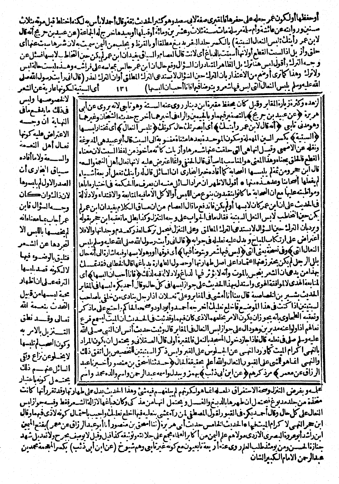أَقُولُ: الْأَظْهَرُ أَنَّ مُرَادَ السَّائِلِ مِنْهُ أَنْ يَعْرِفَ مَا الْحِكْمَةُ فِي اخْتِيَارِهِ إِيَّاهَا وَمُوَاظَبَتِهِ عَلَيْهَا مَعَ أَنَّ الصَّحَابَةَ مَا كَانُوا يَتَقَيَّدُونَ بِنَوْعٍ مِنَ اللُّبْسِ أَوِ الْأَكْلِ إِلَّا مَا فِيهِ الْمُتَابَعَةُ وَالِاقْتِدَاءُ، وَلَا دَلَالَةَ فِي الْحَدِيثِ عَلَى أَنَّ ابْنَ عُمَرَ كَانَ لَابِسَهَا أَوْ لَمْ يَكُنْ فَانْدَفَعَ مَا قَالَ الْعِصَامُ مِنْ أَنَّ مَسَاقَ الْكَلَامِ يُفِيدُ أَنَّ ابْنَ عُمَرَ لَمْ يَكُنْ حِينَ التَّخَاطُبِ لَابِسَ النَّعْلِ السِّبْتِيَّةِ، فَقَالَ مَا فِي الْجَوَابِ عَلَى وَجْهِ التَّنَزُّلِ، وَكَذَا بَطَلَ مَا تَعَقَّبَهُ ابْنُ حَجَرٍ بِقَوْلِهِ: وَيُرَدُّ بِأَنَّ التَّرْكَ حِينَ السُّؤَالِ لَا يَسْتَدْعِي التَّرْكَ الْمُطْلَقَ وَعَلَى التَّنَزُّلِ فَيُحْمَلُ تَرْكُهَا لِعُذْرٍ، كَعَدَمِ وِجْدَانِهَا وَإِلَّا فَالِاعْتِرَاضُ عَلَى ارْتِكَابِ الْمُبَاحِ وَيَدُلُّ عَلَيْهِ تَعْلِيلُهُ فِي جَوَابِهِ (قَالَ: إِنِّي رَأَيْتُ رَسُولَ اللَّهِ صَلَّى اللَّهُ عَلَيْهِ وَسَلَّمَ يَلْبَسُ النِّعَالَ الَّتِي) وَفِي نُسْخَةٍ يَعْنِي الَّتِي (لَيْسَ فِيهَا شَعْرٌ وَيَتَوَضَّأُ فِيهَا) أَيْ فَوْقَهَا أَوْ هُوَ لَابِسُهَا، وَفِيهِ إِشَارَةٌ إِلَى أَنَّهُ حَالَ بَلَلِ الرِّجْلِ لَمْ يَكُنْ يَحْتَرِزُ عَنْهَا، اعْتِمَادًا عَلَى أَصْلِ طَهَارَتِهَا، أَوْ حُصُولِ الطَّهَارَةِ بِدِبَاغَتِهَا، قَالَ الْخَطَّابِيُّ: فَقَدْ تَمَسَّكَ بِهَذَا مَنْ يَدَّعِي أَنَّ الشَّعْرَ يَنْجُسُ بِالْمَوْتِ، وَأَنَّهُ لَا يُؤَثِّرُ فِيهَا الدِّبَاغُ وَلَا دَلَالَةَ فِيهِ لِذَلِكَ (فَأَنَا أُحِبُّ أَنْ أَلْبِسَهَا) أَيْ لِمُتَابَعَةِ الْهَدْيِ، لَا لِمُوَافَقَةِ الْهَوَى، وَاسْتُدِلَّ بِهَذَا الْحَدِيثِ عَلَى جَوَازِ لُبْسِهَا فِي كُلِّ حَالٍ، وَقَالَ أَحْمَدُ: يُكْرَهُ لُبْسُهَا فِي الْمَقَابِرِ لِحَدِيثِ بَشِيرِ بْنِ الْخَصَاصِيَةِ، قَالَ: بَيْنَا أَنَا أَمْشِي فِي الْمَقَابِرِ وَعَلَيَّ نَعْلَانِ إِذَا رَجُلٌ يُنَادِي مِنْ خَلْفِي، يَا صَاحِبَ السِّبْتِيَّتَيْنِ، إِذَا كُنْتَ فِي هَذَا الْمَوْضِعِ فَاخْلَعْ نَعْلَيْكَ، أَخْرَجَهُ أَحْمَدُ وَأَبُو دَاوُدَ وَصَحَّحَهُ الْحَاكِمُ، وَاحْتَجَّ عَلَى مَا ذُكِرَ وَتَعَقَّبَهُ الطَّحَاوِيُّ بِأَنَّهُ يَجُوزُ أَنْ يَكُونَ الْأَمْرُ بِخَلْعِهِمَا لِأَذًى كَانَ فِيهِمَا، وَقَدْ ثَبَتَ فِي الْحَدِيثِ أَنَّ الْمَيِّتَ لَيَسْمَعُ قَرْعَ نِعَالِهِمْ إِذَا وَلَّوْا عَنْهُ مُدْبِرِينَ، وَهُوَ دَالٌّ عَلَى جَوَازِ لُبْسِ النِّعَالِ فِي الْمَقَابِرِ، قَالَ: وَثَبَتَ حَدِيثُ أَنَسٍ أَنَّ النَّبِيَّ صَلَّى اللَّهُ عَلَيْهِ وَسَلَّمَ صَلَّى فِي نَعْلَيْهِ، قَالَ: فَإِذَا جَازَ دُخُولُ الْمَسْجِدِ بِالنَّعْلِ، فَالْمَقْبَرَةُ أَوْلَى، قَالَ الْعَسْقَلَانِيُّ: وَيُحْتَمَلُ أَنْ يَكُونَ الْمُرَادُ بِالنَّهْيِ إِكْرَامَ الْمَيِّتِ كَمَا وَرَدَ النَّهْيُ عَنِ