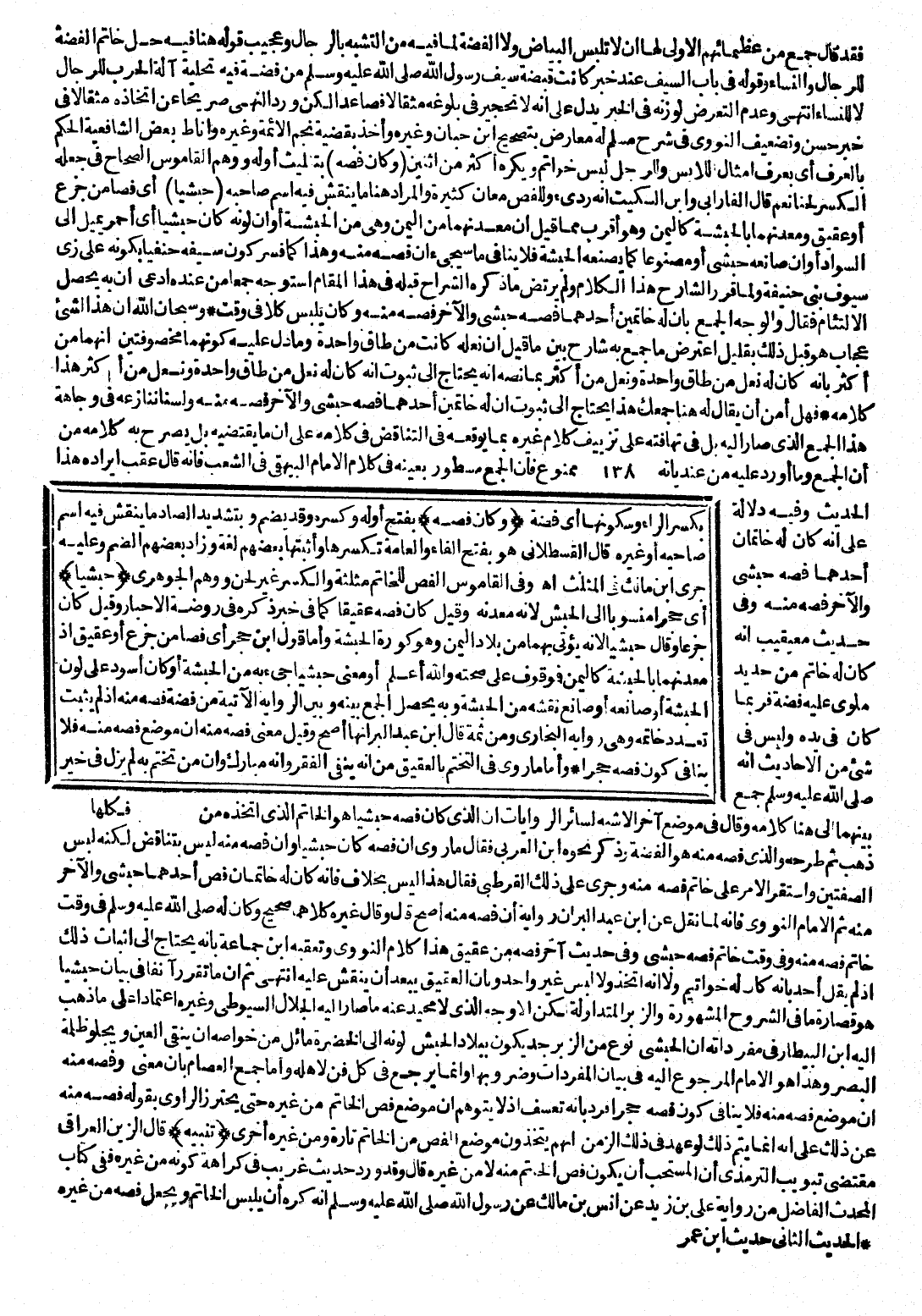 بِلَادِ الْيَمَنِ، وَهُوَ كُورَةُ الْحَبَشَةِ، وَأَمَّا قَوْلُ ابْنِ حَجَرٍ أَيْ فَصًّا مِنْ جَزْعٍ أَوْ عَقِيقٍ، إِذْ مَعْدِنُهُمَا بِالْحَبَشَةِ كَالْيَمَنِ فَمَوْقُوفٌ عَلَى صِحَّتِهِ، وَاللَّهُ أَعْلَمُ. أَوْ مَعْنًى حَبَشِيًّا جِيءَ بِهِ مِنَ الْحَبَشَةِ، أَوْ كَانَ أَسْوَدَ عَلَى لَوْنِ الْحَبَشَةِ، أَوْ صَانِعُهُ أَوْ صَانِعُ نَقْشِهِ مِنَ الْحَبَشَةِ، وَبِهِ يَحْصُلُ الْجَمْعُ بَيْنَهُ وَبَيْنَ الرِّوَايَةِ الْآتِيَةِ مِنْ فِضَّةٍ فَصُّهُ مِنْهُ، إِذْ لَمْ يَثْبُتْ تَعَدُّدُ خَاتَمِهِ، وَهِيَ رِوَايَةُ الْبُخَارِيِّ وَمِنْ ثَمَّةَ، قَالَ ابْنُ عَبْدِ الْبَرِّ: إِنَّهَا أَصَحُّ، وَقِيلَ: مَعْنَى «فَصُّهُ مِنْهُ» أَنَّ مَوْضِعَ فَصِّهِ مِنْهُ فَلَا يُنَافِي كَوْنَ فَصِّهِ حَجَرًا.