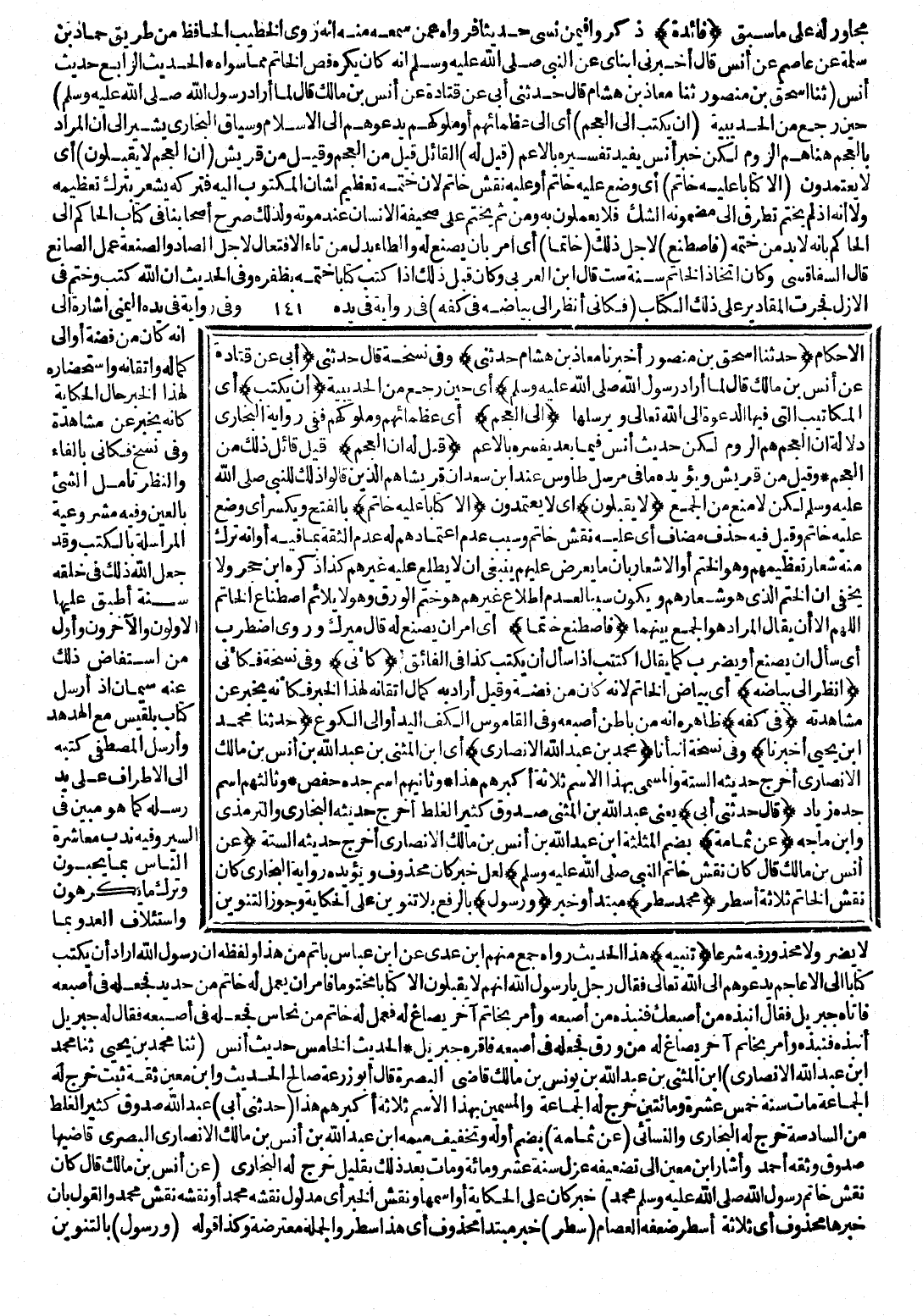 (حَدَّثَنَا إِسْحَاقُ بْنُ مَنْصُورٍ أَخْبَرَنَا مُعَاذُ بْنُ هِشَامٍ حَدَّثَنِي) وَفِي نُسْخَةٍ قَالَ: حَدَّثَنِي (أَبِي عَنْ قَتَادَةَ عَنْ أَنَسِ بْنِ مَالِكٍ قَالَ: لَمَّا أَرَادَ رَسُولُ اللَّهِ صَلَّى اللَّهُ عَلَيْهِ وَسَلَّمَ) أَيْ حِينَ رَجَعَ مِنَ الْحُدَيْبِيَةِ (أَنْ يَكْتُبَ) أَيِ الْمَكَاتِيبَ الَّتِي فِيهَا الدَّعْوَةُ إِلَى اللَّهِ تَعَالَى، وَيُرْسِلَهَا (إِلَى الْعَجَمِ) أَيْ عُظَمَائِهِمْ وَمُلُوكِهِمْ، فَفِي رِوَايَةِ الْبُخَارِيِّ دَلَالَةٌ أَنَّ الْعَجَمَ هُمُ الرُّومُ لَكِنَّ حَدِيثَ أَنَسٍ فِيمَا بَعْدُ يُفَسِّرُهُ بِالْأَعَمِّ (قِيلَ لَهُ أَنَّ الْعَجَمَ) قِيلَ قَائِلُ ذَلِكَ مِنَ الْعَجَمِ.