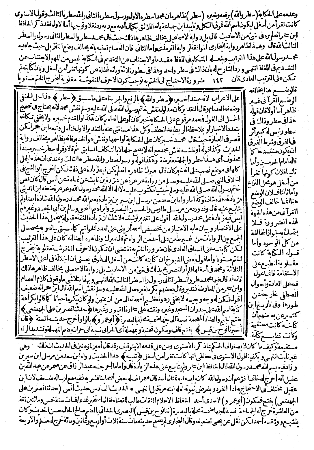 عَلَى الْإِعْرَابِ ; لِأَنَّهُ مُبْتَدَأٌ خَبَرُهُ (سَطْرٌ وَاللَّهُ) بِالرَّفْعِ وَالْجَرِّ بِنَاءً عَلَى مَا سَبَقَ (سَطْرٌ) هَذَا حَلُّ الْحَنَفِيِّ وَضَعَّفَهُ الْعِصَامُ، وَقَالَ: التَّقْدِيرُ كَانَ مَدْلُولُ نَقْشِ خَاتَمِ رَسُولِ اللَّهِ صَلَّى اللَّهُ عَلَيْهِ وَسَلَّمَ نَقْشُ مُحَمَّدٍ ; لِأَنَّهُ يَحْتَاجُ فِي تَصْحِيحِ الْحَمْلِ إِلَى الْقَوْلِ، فَمُحَمَّدٌ مَرْفُوعٌ عَلَى الْحِكَايَةِ، خَبَرُ كَانَ، أَوْ عَلَى أَنَّهُ اسْمُ كَانَ هَكَذَا، وَالْمُقَدَّمُ خَبَرُهُ وَلَا يَخْفَى تَكَلُّفُهُ بِتَعَدُّدِ الْأَخْبَارِ أَوْ بِمُلَاحَظَةِ الرَّبْطِ بَعْدَ الْعَطْفِ، وَكُلُّ هَذَا مُسْتَغْنًى عَنْهُ بِالتَّقْدِيرِ الْأَوَّلِ، فَتَأَمَّلْ، وَتَبِعَهُ ابْنُ حَجَرٍ لَكِنْ قَصَرَ فِي الْعِبَارَةِ، حَيْثُ قَالَ مُحَمَّدٌ خَبَرُ كَانَ عَلَى الْحِكَايَةِ أَوِ اسْمُهَا وَنَقْشٌ هُوَ الْخَبَرُ، فَإِنَّهُ بِظَاهِرِهِ يُخَالِفُ رِوَايَةَ الْحَدِيثِ، وَكَذَا قَوْلُهُ: أَوْ نَقْشُهُ نَقْشُ مُحَمَّدٍ مَعَ أَنَّهُ لَا يَصِحُّ حَمْلُهُ إِلَّا بِالتَّكْلِيفِ السَّابِقِ، ثُمَّ قَالَا وَقَوْلُهُ: سَطْرٌ خَبَرُ مُبْتَدَأٍ مَحْذُوفٍ، أَيْ هَذَا سَطْرٌ، وَالْجُمْلَةُ مُعْتَرِضَةٌ، وَهَكَذَا قَوْلُهُ: وَرَسُولٌ سَطْرٌ، وَاللَّهُ سَطْرُهُ الثَّالِثُ، وَعِنْدِي أَنَّ هَذِهِ الْجُمَلَ كُلَّهَا فِي مَوْضِعِ نَصْبٍ عَلَى أَنَّهُ خَبَرُ كَانَ، قَالَ مِيرَكُ: ظَاهِرُهُ أَنَّهُ لَمْ يَكُنْ فِيهِ زِيَادَةٌ عَلَى ذَلِكَ، لَكِنْ أَخْرَجَ أَبُو الشَّيْخِ فِي أَخْلَاقِ النَّبِيِّ صَلَّى اللَّهُ عَلَيْهِ وَسَلَّمَ مِنْ رِوَايَةِ عَرْعَرَةَ عَنْ عَرْزَةَ بْنِ ثَابِتٍ، عَنْ ثُمَامَةَ عَنْ أَنَسٍ قَالَ: كَانَ فَصُّ خَاتَمِ رَسُولِ اللَّهِ صَلَّى اللَّهُ عَلَيْهِ وَسَلَّمَ حَبَشِيًّا مَكْتُوبٌ عَلَيْهِ لَا إِلَهَ إِلَّا اللَّهُ مُحَمَّدٌ رَسُولُ اللَّهِ، وَعَرْعَرَةُ ضَعَّفَهُ ابْنُ الْمَدِينِيِّ، فَزِيَادَةُ هَذِهِ شَاذَّةٌ، وَكَذَا مَا رَوَاهُ ابْنُ سَعْدٍ مِنْ مُرْسَلِ ابْنِ سِيرِينَ