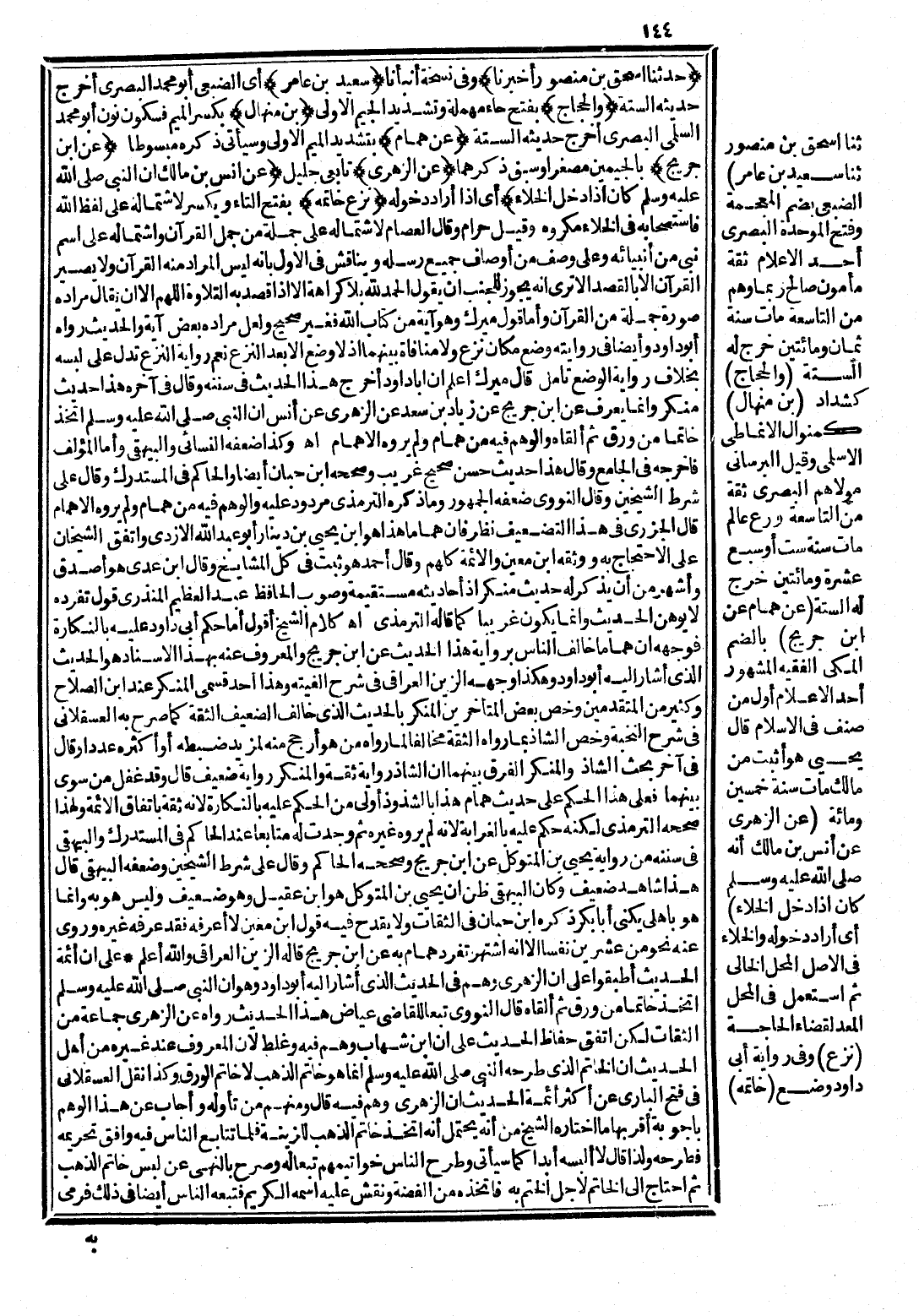 بِفَتْحِ حَاءٍ مُهْمَلَةٍ وَتَشْدِيدِ الْجِيمِ الْأُولَى (بْنُ مِنْهَالٍ) بِكَسْرِ الْمِيمِ فَسُكُونِ نُونٍ أَبُو مُحَمَّدٍ السُّلَمِيُّ الْبَصْرِيُّ، أَخْرَجَ حَدِيثَهُ السِّتَّةُ (عَنْ هَمَّامٍ) بِتَشْدِيدِ الْمِيمِ الْأُولَى وَسَيَأْتِي ذِكْرُهُ مَبْسُوطًا (عَنِ ابْنِ جُرَيْجٍ) بِالْجِيمَيْنِ مُصَغَّرًا وَسَبَقَ ذِكْرُهُمَا (عَنِ الزُّهْرِيِّ) تَابِعِيٌّ جَلِيلٌ (عَنْ أَنَسِ بْنِ مَالِكٍ أَنَّ النَّبِيَّ صَلَّى اللَّهُ عَلَيْهِ وَسَلَّمَ كَانَ إِذَا دَخَلَ الْخَلَاءَ) أَيْ إِذَا أَرَادَ دُخُولَهُ (نَزَعَ خَاتَمَهُ) بِفَتْحِ التَّاءِ وَيُكْسَرُ لِاشْتِمَالِهِ عَلَى لَفْظِ اللَّهِ، فَاسْتِصْحَابُهُ فِي الْخَلَاءِ مَكْرُوهٌ، وَقِيلَ: حَرَامٌ، وَقَالَ الْعِصَامُ: لِاشْتِمَالِهِ عَلَى جُمْلَةٍ مِنْ جُمَلِ الْقُرْآنِ، وَاشْتِمَالِهِ عَلَى اسْمِ نَبِيٍّ مِنْ أَنْبِيَائِهِ، وَعَلَى وَصْفٍ مِنْ أَوْصَافِ جَمِيعِ رُسُلِهِ، وَيُنَاقَشُ فِي الْأَوَّلِ بِأَنَّهُ لَيْسَ الْمُرَادُ مِنْهُ الْقُرْآنَ، وَلَا يَصِيرُ الْقُرْآنُ إِلَّا بِالْقَصْدِ، أَلَا تَرَى أَنَّهُ يَجُوزُ لِلْجُنُبِ أَنْ يَقُولَ: الْحَمْدُ لِلَّهِ بِلَا كَرَاهَةٍ، إِلَّا إِذَا قَصَدَ بِهِ التِّلَاوَةَ، اللَّهُمَّ إِلَّا أَنْ يُقَالَ: مُرَادُهُ صُورَةُ جُمْلَةٍ مِنَ الْقُرْآنِ، وَأَمَّا قَوْلُ مِيرَكَ: وَهُوَ آيَةٌ مِنْ كِتَابِ اللَّهِ، فَغَيْرُ صَحِيحٍ ; وَلَعَلَّ مُرَادَهُ بَعْضُ آيَةٍ، وَالْحَدِيثُ رَوَاهُ أَبُو دَاوُدَ أَيْضًا وَفِي رِوَايَتِهِ، وَضَعَ مَكَانَ نَزَعَ وَلَا مُنَافَاةَ بَيْنَهُمَا، إِذْ لَا وَضْعَ إِلَّا بَعْدَ النَّزْعِ، نَعَمْ رِوَايَةُ النَّزْعِ تَدُلُّ عَلَى لُبْسِهِ بِخِلَافِ رِوَايَةِ الْوَضْعِ، تَأَمَّلْ قَالَ مِيرَكُ: اعْلَمْ أَنَّ أَبَا دَاوُدَ أَخْرَجَ هَذَا الْحَدِيثَ فِي سُنَنِهِ، وَقَالَ فِي آخِرِهِ: هَذَا حَدِيثٌ مُنْكَرٌ، وَإِنَّمَا يُعْرَفُ عَنِ ابْنِ جُرَيْجٍ عَنْ زِيَادِ بْنِ سَعْدٍ عَنِ الزُّهْرِيِّ، عَنْ أَنَسٍ أَنَّ النَّبِيَّ صَلَّى اللَّهُ عَلَيْهِ وَسَلَّمَ اتَّخَذَ خَاتَمًا مِنْ وَرِقٍ، ثُمَّ أَلْقَاهُ وَالْوَهْمُ فِيهِ مِنْ هَمَّامٍ، وَلَمْ يَرْوِهِ إِلَّا هَمَّامٌ انْتَهَى. وَكَذَا ضَعَّفَهُ النَّسَائِيُّ وَالْبَيْهَقِيُّ، وَأَمَّا الْمُؤَلِّفُ فَأَخْرَجَهُ فِي الْجَامِعِ، وَقَالَ: هَذَا حَدِيثٌ حَسَنٌ صَحِيحٌ غَرِيبٌ، وَصَحَّحَهُ ابْنُ حِبَّانَ أَيْضًا، وَالْحَاكِمُ فِي الْمُسْتَدْرَكِ، وَقَالَ: عَلَى شَرْطِ الشَّيْخَيْنِ، وَقَالَ النَّوَوِيُّ: ضَعَّفَهُ الْجُمْهُورُ، وَمَا ذَكَرَهُ التِّرْمِذِيُّ، مَرْدُودٌ عَلَيْهِ، وَالْوَهْمُ فِيهِ مِنْ هَمَّامٍ، وَلَمْ يَرْوِهِ إِلَّا هَمَّامٌ، قَالَ الْجَزَرِيُّ: فِي هَذَا التَّضْعِيفِ نَظَرٌ، فَإِنَّ هَمَّامًا هَذَا هُوَ ابْنُ يَحْيَى بْنِ دِينَارٍ أَبُو عَبْدِ اللَّهِ الْأَزْدِيُّ، وَاتَّفَقَ الشَّيْخَانِ عَلَى الِاحْتِجَاجِ بِهِ، وَوَثَّقَهُ ابْنُ مَعِينٍ وَالْأَئِمَّةُ كُلُّهُمْ، وَقَالَ أَحْمَدُ: هُوَ ثَبْتٌ فِي كُلِّ الْمَشَايِخِ، وَقَالَ ابْنُ رَعْدِيٍّ: هُوَ أَصْدَقُ وَأَشْهَرُ مِنْ أَنْ يُذْكَرَ لَهُ حَدِيثٌ مُنْكَرٌ، إِذْ أَحَادِيثُهُ مُسْتَقِيمَةٌ، وَصَوَّبَ الْحَافِظُ عَبْدُ الْعَظِيمِ الْمُنْذِرِيُّ قَوْلَ تَفَرُّدِهِ لَا يُوهِنُ الْحَدِيثَ، وَإِنَّمَا يَكُونُ غَرِيبًا كَمَا قَالَهُ التِّرْمِذِيُّ، انْتَهَى كَلَامُ الشَّيْخِ، أَقُولُ: أَمَّا حُكْمُ أَبِي دَاوُدَ عَلَيْهِ بِالنَّكَارَةِ فَوَجْهُهُ أَنَّ هَمَّامًا خَالَفَ النَّاسَ بِرِوَايَةِ هَذَا الْحَدِيثِ عَنِ ابْنِ جُرَيْجٍ، وَالْمَعْرُوفُ عَنْهُ بِهَذَا الْإِسْنَادِ هُوَ الْحَدِيثُ الَّذِي أَشَارَ إِلَيْهِ أَبُو دَاوُدَ، وَهَكَذَا وَ