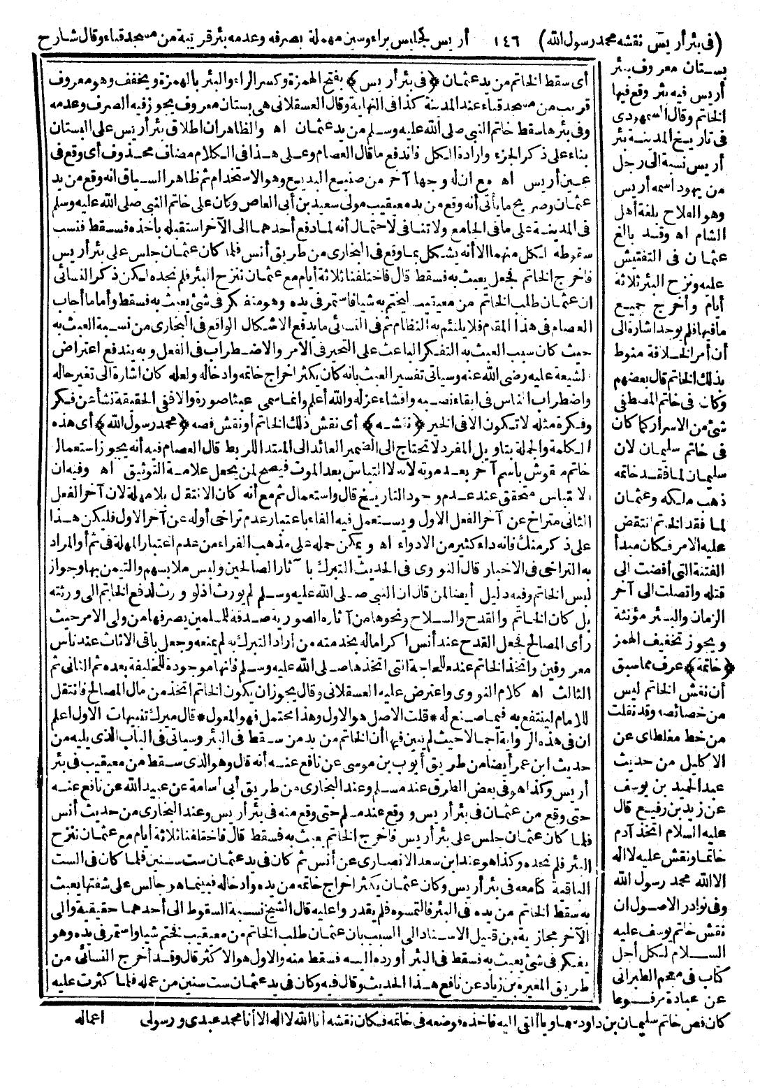 أَيْ سَقَطَ الْخَاتَمُ مِنْ يَدِ عُثْمَانَ (فِي بِئْرِ أَرِيسَ) بِفَتْحِ الْهَمْزَةِ وَكَسْرِ الرَّاءِ وَالْبِئْرُ بِالْهَمْزَةِ وَيُخَفَّفُ وَهُوَ مَعْرُوفٌ قَرِيبٌ مِنْ مَسْجِدِ قُبَاءٍ عِنْدَ الْمَدِينَةِ، كَذَا فِي النِّهَايَةِ، وَقَالَ الْعَسْقَلَانِيُّ: وَهُوَ بُسْتَانٌ مَعْرُوفٌ يَجُوزُ فِيهِ الصَّرْفُ وَعَدَمُهُ، وَفِي بِئْرِهَا سَقَطَ خَاتَمُ النَّبِيِّ صَلَّى اللَّهُ عَلَيْهِ وَسَلَّمَ، مِنْ يَدِ عُثْمَانَ انْتَهَى. وَالظَّاهِرُ أَنَّ إِطْلَاقَ بِئْرِ أَرِيسَ عَلَى الْبُسْتَانِ بِنَاءً عَلَى ذِكْرِ الْجُزْءِ وَإِرَادَةِ الْكُلِّ فَانْدَفَعَ مَا قَالَ الْعِصَامُ: وَعَلَى هَذَا فِي الْكَلَامِ مُضَافٌ مَحْذُوفٌ أَيْ وَقَعَ (فِي بِئْرِ أَرِيسَ) انْتَهَى. مَعَ أَنَّ لَهُ وَجْهًا آخَرَ مِنْ صَنِيعِ الْبَدِيعِيِّ، وَهُوَ الِاسْتِخْدَامُ ثُمَّ ظَاهِرُ السِّيَاقِ أَنَّهُ وَقَعَ مِنْ يَدِ عُثْمَانَ، وَصَرِيحُ مَا يَأْتِي أَنَّهُ وَقَعَ مِنْ يَدِ مُعَيْقِيبٍ مَوْلَى سَعِيدِ بْنِ أَبِي الْعَاصِ، وَكَانَ عَلَى خَاتَمِ النَّبِيِّ صَلَّى اللَّهُ عَلَيْهِ وَسَلَّمَ فِي الْمَدِينَةِ عَلَى مَا فِي الْجَامِعِ، وَلَا تَنَافِيَ لِاحْتِمَالِ أَنَّهُ لَمَّا دَفَعَ أَحَدُهُمَا إِلَى الْآخَرِ اسْتَقْبَلَهُ بِأَخْذِهِ، فَسَقَطَ فَنُسِبَ سُقُوطُهُ لِكُلٍّ مِنْهُمَا، إِلَّا أَنَّهُ يُشْكِلُ بِمَا وَقَعَ فِي الْبُخَارِيِّ مِنْ طَرِيقِ أَنَسٍ، فَلَمَّا كَانَ عُثْمَانُ جَالِسًا عَلَى بِئْرِ أَرِيسَ فَأَخْرَجَ الْخَاتَمَ، فَجَعَلَ يَعْبَثُ بِهِ فَسَقَطَ، قَالَ: فَاخْتَلَفْنَا ثَلَاثَةَ أَيَّامٍ مَعَ عُثْمَانَ نَنْزَحُ الْبِئْرَ فَلَمْ نَجِدْهُ، لَكِنْ ذَكَرَ النَّسَائِيُّ أَنَّ عُثْمَانَ طَلَبَ الْخَاتَمَ مِنْ مُعَيْقِيبٍ لِيَخْتِمَ بِهِ شَيْئًا فَاسْتَمَرَّ فِي يَدِهِ، وَهُوَ مُتَفَكِّرٌ فِي شَيْءٍ يَعْبَثُ بِهِ فَسَقَطَ، وَأَمَّا مَا أَجَابَهُ الْعِصَامُ فِي هَذَا الْمَقَامِ فَلَا يَلْتَئِمُ بِهِ النِّظَامُ، ثُمَّ فِي النَّسَائِيُّ مَا يَدْفَعُ الْإِشْكَالَ الْوَاقِعَ فِي الْبُخَارِيِّ مِنْ نِسْبَةِ الْعَبَثِ بِهِ، حَيْثُ كَانَ سَبَبُ الْعَبَثِ بِهِ التَّفَكُّرَ الْبَاعِثَ عَلَى التَّحَيُّرِ فِي الْأَمْرِ، وَالِاضْطِرَابِ فِي الْفِعْلِ، وَبِهِ يَنْدَفِعُ اعْتِرَاضُ الشِّيعَةِ عَلَيْهِ رَضِيَ اللَّهُ عَنْهُ، وَسَيَأْتِي تَفْسِيرُ الْعَبَثِ بِأَنَّهُ كَانَ يُكْثِرُ إِخْرَاجَ خَاتَمِهِ وَإِدْخَالَهُ، وَلَعَلَّهُ كَانَ إِشَارَةً إِلَى تَغَيُّرِ حَالِهِ وَاضْطِرَابِ النَّاسِ فِي إِبْقَاءِ نَصْبِهِ، وَإِفْشَاءِ عَزْلِهِ وَاللَّهُ أَعْلَمُ، وَإِنَّمَا سُمِّيَ عَبَثًا صُورَةً وَإِلَّا فَفِي الْحَقِيقَةِ نَشَأَ عَنْ فِكْرٍ وَفِكْرَةُ مِثْلِهِ لَا تَكُونُ إِلَّا فِي الْحَيْرَةِ، (نَقْشُهُ) أَيْ نَقْشُ ذَلِكَ الْخَاتَمِ أَوْ نَقْشُ فَصِّهِ (مُحَمَّدٌ رَسُولُ اللَّهِ) أَيْ هَذِهِ الْكَلِمَةُ وَالْجُمْلَةُ بِتَأْوِيلِ الْمُفْرَدِ لَا تَحْتَاجُ إِلَى الضَّمِيرِ الْعَائِدِ إِلَى الْمُبْتَدَأِ لِلرَّبْطِ قَالَ الْعِصَامُ: فِيهِ أَنَّهُ يَجُوزُ اسْتِعْمَالُ خَاتَمٍ مَنْقُوشٍ بِاسْمٍ آخَرَ بَعْدَ مَوْتِهِ ; لِأَنَّهُ لَا الْتِبَاسَ بَعْدَ الْمَوْتِ فَيَصِحُّ أَنْ يُجْعَلَ عَلَامَةَ التَّوْثِيقِ انْتَهَى. وَفِيهِ أَنَّ الِالْتِبَاسَ مُتَحَقِّقٌ عِنْدَ عَدَمِ وُجُودِ التَّارِيخِ، قَالَ: وَاسْتِعْمَالُ ثُمَّ مَعَ أَنَّهُ كَانَ الِانْتِقَالُ بِلَا مُهْلَةٍ؛ لِأَنَّ آخِرَ الْفِعْلِ الثَّانِي مُتَرَاخٍ عَنْ آخِرِ الْفِعْلِ الْأَوَّلِ، وَيُسْتَعْمَلُ فِيهِ الْفَاءُ بِاعْتِبَارِ عَدَمِ تَرَاخِي أَوَّلِهِ عَنْ آخِرِ الْأَوَّلِ، فَلْيَكُنْ هَذَا عَلَى ذِكْرٍ مِنْكَ، فَإِنَّهُ دَاءُ كَ