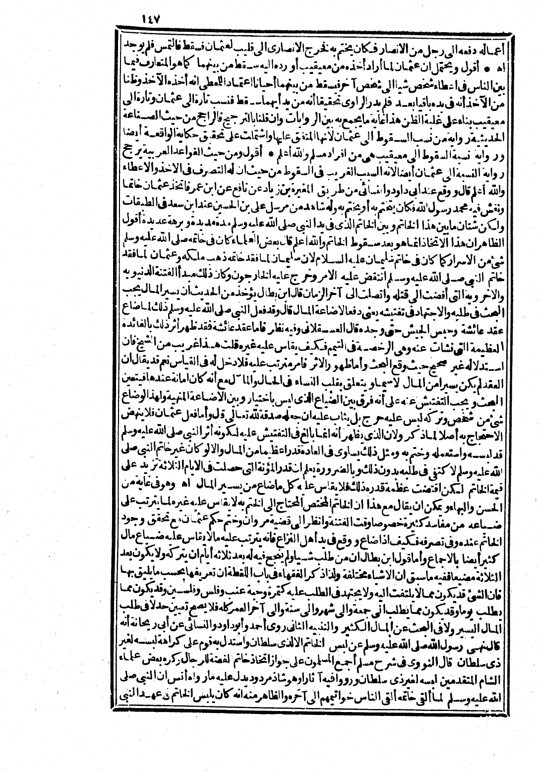 أَعْمَالُهُ دَفَعَهُ إِلَى رَجُلٍ مِنَ الْأَنْصَارِ، فَكَانَ يَخْتِمُ بِهِ فَخَرَجَ الْأَنْصَارِيُّ إِلَى قَلِيبٍ لِعُثْمَانَ فَسَقَطَ، فَالْتُمِسَ فَلَمْ يُوجَدْ. انْتَهَى.