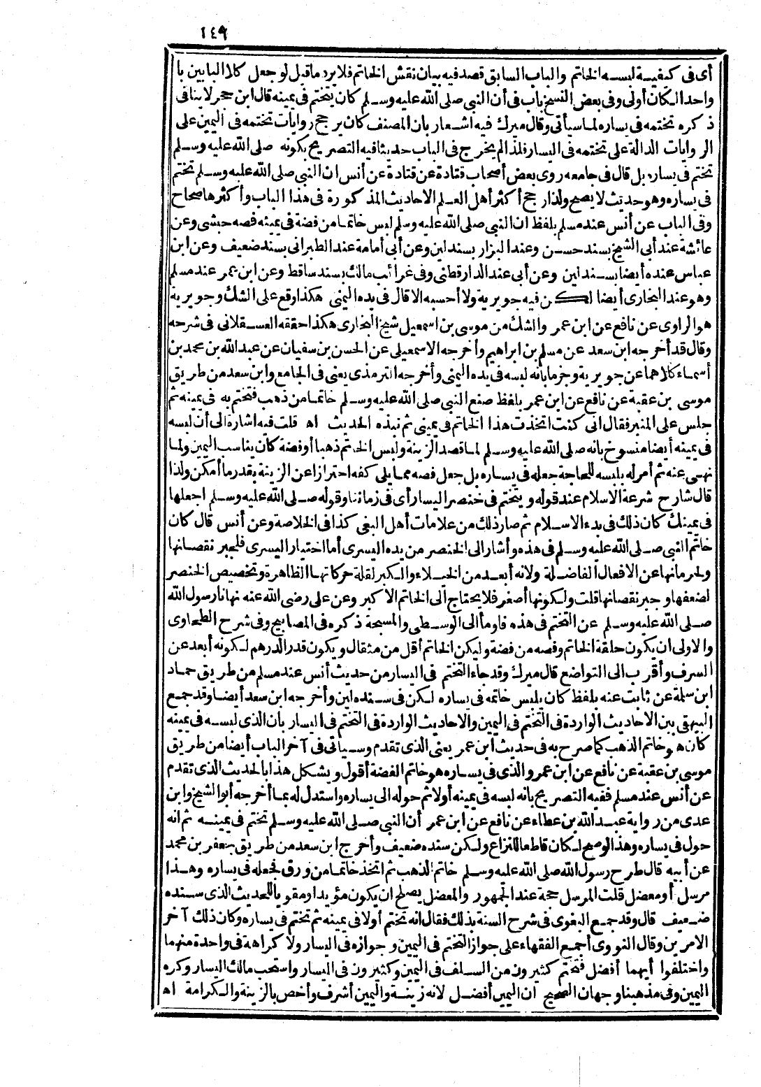 عِنْدَ الدَّارَقُطْنِيِّ وَفِي غَرَائِبِ مَالِكٍ بِسَنَدٍ سَاقِطٍ، وَعَنِ ابْنِ عُمَرَ عِنْدَ مُسْلِمٍ وَهُوَ عِنْدَ الْبُخَارِيِّ أَيْضًا، لَكِنْ فِيهِ جُوَيْرِيَةُ وَلَا أَحْسَبُهُ إِلَّا قَالَ فِي يَدِهِ الْيُمْنَى، هَكَذَا وَقَعَ عَلَى الشَّكِّ وَجُوَيْرِيَةُ هُوَ الرَّاوِي عَنْ نَافِعٍ عَنِ ابْنِ عُمَرَ، وَالشَّكُّ مِنْ مُوسَى بْنِ إِسْمَاعِيلَ شَيْخِ الْبُخَارِيِّ هَكَذَا، حَقَّقَهُ الْعَسْقَلَانِيُّ فِي شَرْحِهِ، وَقَالَ: قَدْ أَخْرَجَهُ ابْنُ سَعْدٍ عَنْ مُسْلِمِ بْنِ إِبْرَاهِيمَ وَأَخْرَجَهُ الْإِسْمَاعِيلِيُّ عَنِ الْحَسَنِ بْنِ سُفْيَانَ، عَنْ عَبْدِ اللَّهِ بْنِ مُحَمَّدِ بْنِ أَسْمَاءَ كِلَاهُمَا عَنْ جُوَيْرِيَةَ، وَجَزَمَا بِأَنَّهُ لَبِسَهُ فِي يَدِهِ الْيُمْنَى، وَأَخْرَجَهُ التِّرْمِذِيُّ يَعْنِي فِي الْجَامِعِ وَابْنُ سَعْدٍ مِنْ طَرِيقِ مُوسَى بْنِ عُقْبَةَ، عَنْ نَافِعٍ عَنِ ابْنِ عُمَرَ بِلَفْظِ: «صَنَعَ النَّبِيُّ صَلَّى اللَّهُ عَلَيْهِ وَسَلَّمَ خَاتَمًا مِنْ ذَهَبٍ فَتَخَتَّمَ بِهِ فِي يَمِينِهِ، ثُمَّ جَلَسَ عَلَى الْمِنْبَرِ، فَقَالَ: إِنِّي كُنْتُ اتَّخَذْتُ هَذَا الْخَاتَمَ فِي يَمِينِي ثُمَّ نَبَذَهُ» الْحَدِيثَ، انْتَهَى. قُلْتُ: فِيهِ إِشَارَةٌ إِلَى أَنَّ لُبْسَهُ فِي يَمِينِهِ أَيْضًا مَنْسُوخٌ بِأَنَّهُ صَلَّى اللَّهُ عَلَيْهِ وَسَلَّمَ لَمَا قَصَدَ الزِّينَةَ، وَلُبْسُ الْخَاتَمِ ذَهَبًا أَوْ فِضَّةً كَانَ يُنَاسِبُ الْيَمِينَ، وَلَمَّا نَهَى عَنْهُ ثُمَّ أُمِرَ لَهُ بِلَبْسِهِ لِلْحَاجَةِ جَعَلَهُ فِي يَسَارِهِ، بَلْ جَعَلَ فَصَّهُ مِمَّا يَلِي كَفَّهُ احْتِرَازًا عَنِ الزِّينَةِ، بِقَدْرِ مَا أَمْكَنَ ; وَلِذَا قَالَ شَارِحُ شِرْعَةِ الْإِسْلَامِ عِنْدَ قَوْلِهِ: وَيُتَخَتَّمُ فِي خِنْصَرِ الْيَسَارِ، أَيْ فِي زَمَانِنَا وَقَوْلُهُ صَلَّى اللَّهُ عَلَيْهِ وَسَلَّمَ: اجْعَلْهَا فِي يَمِينِكَ، كَانَ ذَلِكَ فِي بِدْءِ الْإِسْلَامِ، ثُمَّ صَارَ ذَلِكَ مِنْ عَلَامَاتِ أَهْلِ الْبَغْيِ، كَذَا فِي الْخُلَاصَةِ، وَعَنْ أَنَسٍ قَالَ: كَانَ خَاتَمُ النَّبِيِّ صَلَّى اللَّهُ عَلَيْهِ وَسَلَّمَ فِي هَذِهِ، وَأَشَارَ إِلَى الْخِنْصَرِ مِنْ يَدِهِ الْيُسْرَى، أَمَّا اخْتِيَارُ الْيُسْرَى فَلِجَبْرِ نُقْصَانِهَا وَلِحِرْمَانِهَا عَنِ الْأَفْعَالِ الْفَاضِلَةِ ; وَلِأَنَّهُ أَبْعَدُ مِنَ الْخُيَلَاءِ وَالْكِبْرِ، لِقِلَّةِ حَرَكَاتِهَا الظَّاهِرَةِ، وَتَخْصِيصُ الْخِنْصَرِ لِضَعْفِهَا، وَجَبْرِ نُقْصَانِهَا، قُلْتُ: وَلِكَوْنِهَا أَصْغَرَ فَلَا يَحْتَاجُ إِلَى الْخَاتَمِ الْأَكْبَرِ، وَعَنْ عَلِيٍّ رَضِيَ اللَّهُ عَنْهُ نَهَانَا رَسُولُ اللَّهِ صَلَّى اللَّهُ عَلَيْهِ وَسَلَّمَ عَنِ التَّخَتُّمِ فِي هَذِهِ، فَأَوْمَأَ إِلَى الْوُسْطَى وَالْمُسَبِّحَةِ، ذَكَرَهُ فِي الْمَصَابِيحِ، وَفِي شَرْحِ الطَّحَاوِيِّ وَالْأَوْلَى أَنْ يَكُونَ حَلْقَةُ الْخَاتَمِ وَفَصُّهُ مِنْ فِضَّةٍ، وَلِيَكُنِ الْخَاتَمُ أَقَلَّ مِنْ مِثْقَالٍ، وَيَكُونُ قَدْرَ الدِّرْهَمِ ; لِكَوْنِهِ أَبْعَدَ عَنِ السَّرَفِ وَأَقْرَبَ إِلَى التَّوَاضُعِ، قَالَ مِيرَكُ: وَقَدْ جَاءَ التَّخَتُّمُ فِي الْيَسَارِ مِنْ حَدِيثِ أَنَسٍ عِنْدَ مُسْلِمٍ مِنْ طَرِيقِ حَمَّادِ بْنِ سَلَمَةَ عَنْ ثَابِتٍ عَنْهُ بِلَفْظِ: «كَانَ يَلْبَسُ خَاتَمَهُ فِي يَسَارِهِ» ، لَكِنْ فِي سَنَدِهِ لِينٌ، وَأَخْرَجَهُ ابْنُ سَعْدٍ أَيْضًا، وَقَدْ جَمَعَ الْبَيْهَقِيُّ بَيْنَ الْأَحَادِيثِ الْوَارِدَةِ فِي التَّخَتُّمِ فِي الْيَمِينِ، وَالْأَحَادِيثِ الْوَارِدَةِ فِي التَّخَتُّمِ فِي الْيَسَارِ، بِأَنَّ الَّذِي لَبِسَهُ فِي يَمِينِهِ كَانَ هُوَ خَاتَمُ الذَّهَبِ، كَمَا صَرَّحَ بِهِ