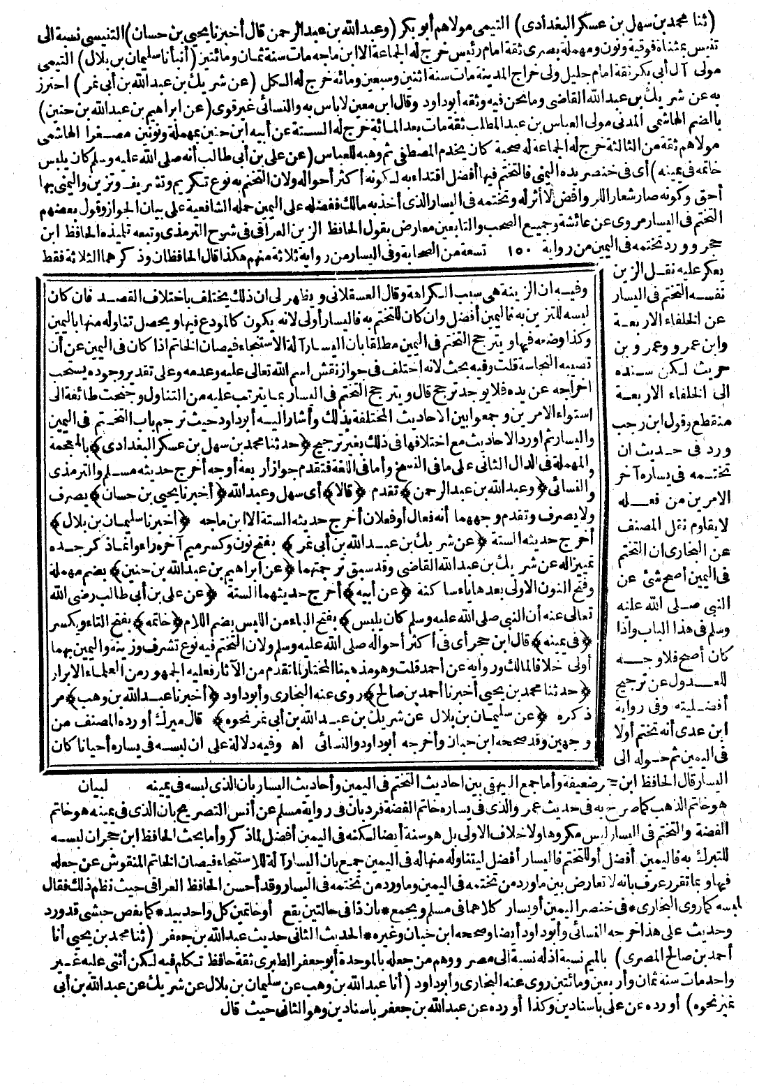 (حَدَّثَنَا مُحَمَّدُ بْنُ سَهْلِ بْنِ عَسْكَرٍ الْبَغْدَادِيُّ) بِالْمُعْجَمَةِ وَالْمُهْمَلَةِ فِي الدَّالِ الثَّانِي عَلَى مَا فِي النُّسَخِ، وَأَمَّا فِي اللُّغَةِ فَتَقَدَّمَ جَوَازُ أَرْبَعَةِ أَوْجُهٍ، أَخْرَجَ حَدِيثَهُ مُسْلِمٌ وَالتِّرْمِذِيُّ وَالنَّسَائِيُّ (وَعَبْدُ اللَّهِ بْنُ عَبْدِ الرَّحْمَنِ) تَقَدَّمَ (قَالَا) أَيْ سَهْلٌ وَعَبْدُ اللَّهِ (أَخْبَرَنَا يَحْيَى بْنُ حَسَّانَ) يُصْرَفُ وَلَا يُصْرَفُ وَتَقَدَّمَ، وَجْهُهُمَا أَنَّهُ فِعَالٌ أَوْ فِعْلَانٌ، أَخْرَجَ حَدِيثَهُ السِّتَّةُ إِلَّا ابْنُ مَاجَهْ (أَخْبَرَنَا سُلَيْمَانُ بْنُ بِلَالٍ) أَخْرَجَ حَدِيثَهُ السِّتَّةُ (عَنْ شَرِيكِ بْنِ عَبْدِ اللَّهِ بْنِ أَبِي نَمِرٍ) بِفَتْحِ نُونٍ وَكَسْرِ مِيمٍ آخِرُهُ رَاءٌ، وَإِنَّمَا ذَكَرَ جَدَّهُ تَمْيِيزًا لَهُ عَنْ شَرِيكِ بْنِ عَبْدِ اللَّهِ الْقَاضِي وَقَدْ سَبَقَ تَرْجَمَتُهُمَا (عَنْ إِبْرَاهِيمَ بْنِ عَبْدِ اللَّهِ بْنِ حُنَيْنٍ) بِضَمِّ مُهْمَلَةٍ وَفَتْحِ النُّونِ الْأُولَى بَعْدَهَا يَاءٌ سَاكِنَةٌ (عَنْ أَبِيهِ) أَخْرَجَ حَدِيثَهُمَا السِّتَّةُ (عَنْ عَلِيِّ بْنِ أَبِي طَالِبٍ رَضِيَ اللَّهُ عَنْهُ أَنَّ النَّبِيَّ صَلَّى اللَّهُ عَلَيْهِ وَسَلَّمَ كَانَ يَلْبَسُ) بِفَتْحِ الْبَاءِ مِنَ اللُّبْسِ بِضَمِّ اللَّامِ (خَاتَمَهُ) بِفَتْحِ التَّاءِ وَيُكْسَرُ (فِي يَمِينِهِ) قَالَ ابْنُ حَجَرٍ أَيْ