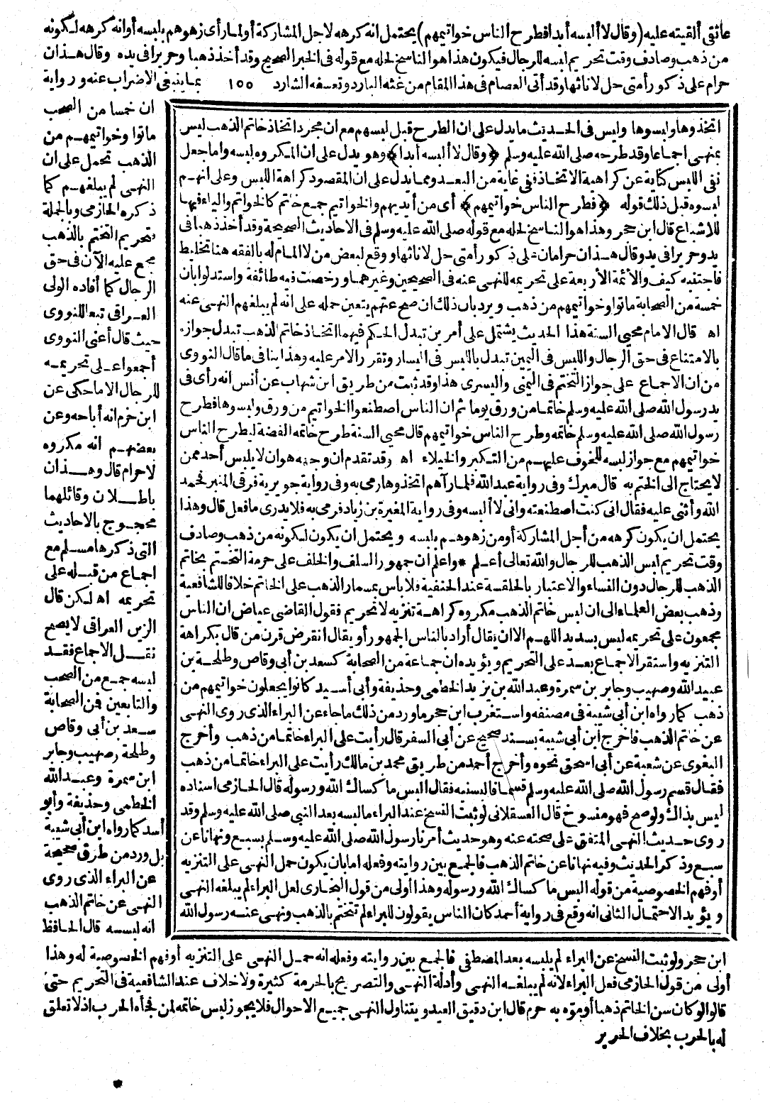وَاعْلَمْ أَنَّ جُمْهُورَ السَّلَفِ وَالْخَلَفِ عَلَى حُرْمَةِ التَّخَتُّمِ بِخَاتَمِ الذَّهَبِ لِلرِّجَالِ دُونَ النِّسَاءِ، وَالِاعْتِبَارُ بِالْحَلْقَةِ عِنْدَ الْحَنَفِيَّةِ فَلَا بَأْسَ، بِمِسْمَارِ الذَّهَبِ عَلَى الْخَاتَمِ خِلَافًا لِلشَّافِعِيَّةِ، وَذَهَبَ بَعْضُ الْعُلَمَاءِ إِلَى أَنَّ لُبْسَ خَاتَمِ الذَّهَبِ مَكْرُوهٌ كَرَاهَةَ تَنْزِيهٍ، لَا تَحْرِيمٍ، فَقَوْلُ الْقَاضِي عِيَاضٍ أَنَّ النَّاسَ مُجْمِعُونَ عَلَى تَحْرِيمِهِ، لَيْسَ بِسَدِيدٍ، اللَّهُمَّ إِلَّا أَنْ يُقَالَ: أَرَادَ بِالنَّاسِ الْجُمْهُورَ، أَوْ يُقَالَ: انْقَرَضَ قَرْنُ مَنْ قَالَ بِكَرَاهَةِ