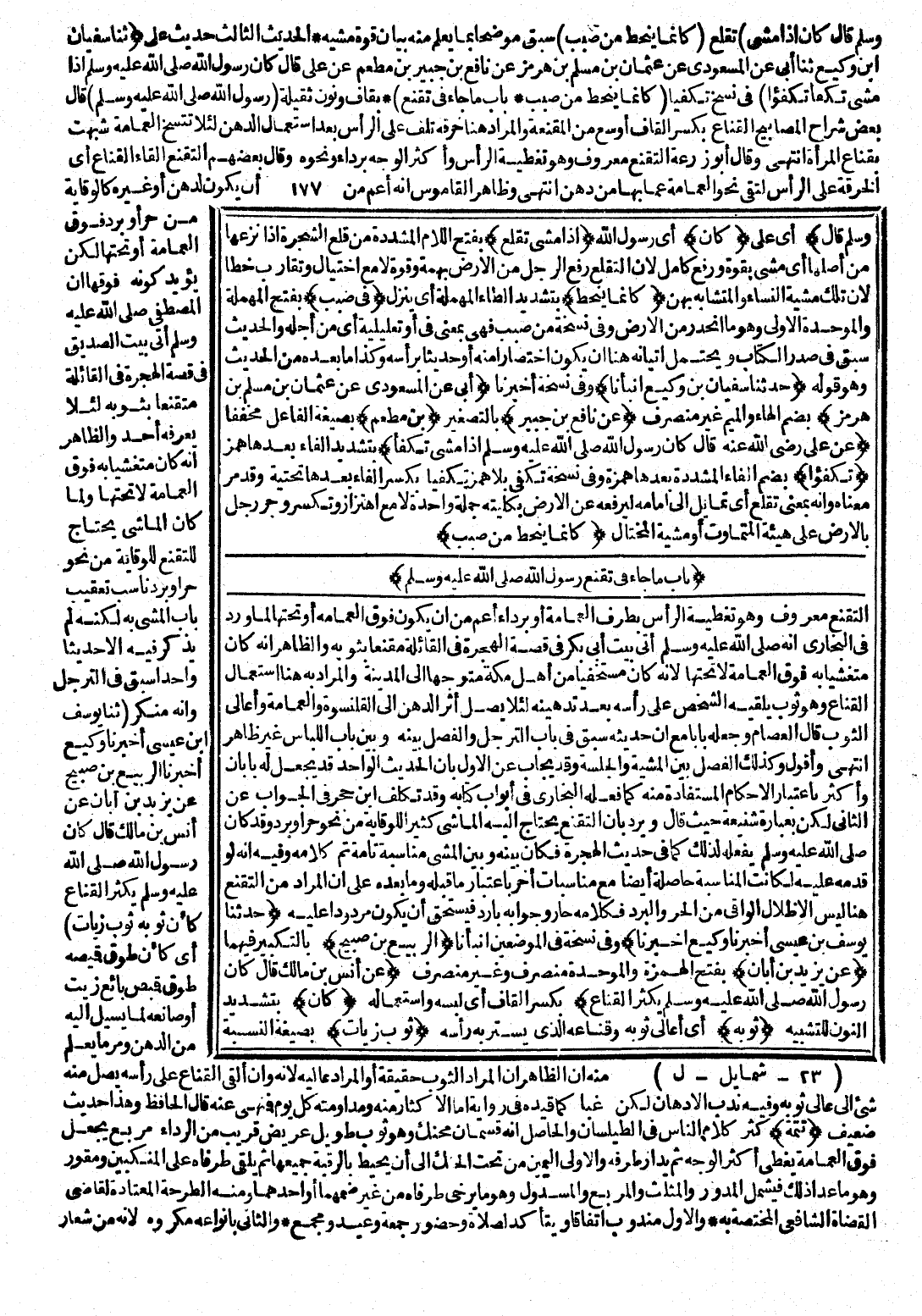 التَّقَنُّعُ مَعْرُوفٌ، وَهُوَ تَغْطِيَةُ الرَّأْسِ بِطَرَفِ الْعِمَامَةِ، أَوْ بِرِدَاءٍ أَعَمَّ مِنْ أَنْ يَكُونَ فَوْقَ الْعِمَامَةِ أَوْ تَحْتَهَا، لِمَا وَرَدَ فِي الْبُخَارِيِّ أَنَّهُ صَلَّى اللَّهُ عَلَيْهِ وَسَلَّمَ أَتَى بَيْتَ أَبِي بَكْرٍ فِي قِصَّةِ الْهِجْرَةِ فِي الْقَائِلَةِ مُتَقَنِّعًا بِثَوْبِهِ، وَالظَّاهِرُ أَنَّهُ كَانَ مُتَغَشِّيًا بِهِ فَوْقَ الْعِمَامَةِ لَا تَحْتَهَا ; لِأَنَّهُ كَانَ مُسْتَخْفِيًا مِنْ أَهْلِ مَكَّةَ مُتَوَجِّهًا إِلَى الْمَدِينَةِ، وَالْمُرَادُ بِهِ هُنَا اسْتِعْمَالُ الْقِنَاعِ وَهُوَ ثَوْبٌ يُلْقِي بِهِ الشَّخْصُ عَلَى رَأْسِهِ بَعْدَ تَدْهِينِهِ ; لِئَلَّا يَصِلَ أَثَرُ الدُّهْنِ إِلَى الْقَلَنْسُوَةِ وَالْعِمَامَةِ وَأَعَالِي الثَّوْبِ، قَالَ الْعِصَامُ: وَجَعَلَهُ بَابًا مَعَ أَنَّ حَدِيثَهُ سَبَقَ فِي بَابِ التَّرَجُّلِ وَالْفَصْلِ بَيْنَهُ وَبَيْنَ بَابِ اللُّبَاسِ غَيْرُ ظَاهِرٍ انْتَهَى. وَأَقُولُ: وَكَذَلِكَ الْفَصْلُ بَيْنَ الْمِشْيَةِ وَالْجِلْسَةِ، وَقَدْ يُجَابُ عَنِ الْأَوَّلِ بِأَنَّ الْحَدِيثَ الْوَاحِدَ قَدْ يُجْعَلُ لَهُ بَابَانِ وَأَكْثَرَ، بِاعْتِبَارِ الْأَحْكَامِ الْمُسْتَفَادَةِ مِنْهُ، كَمَا فَعَلَهُ الْبُخَارِيُّ فِي أَبْوَابِ كِتَابِهِ، وَقَدْ تَكَلَّفَ ابْنُ حَجَرٍ فِي الْجَوَابِ عَنِ الثَّانِي لَكِنْ بِعِبَارَةٍ شَنِيعَةٍ حَيْثُ قَالَ: وَيَرُدُّ بِأَنَّ التَّقَنُّعَ يَحْتَاجُ إِلَيْهِ الْمَاشِي كَثِيرًا لِلْوِقَايَةِ مِنْ نَحْوِ حَرٍّ أَوْ بَرْدٍ.