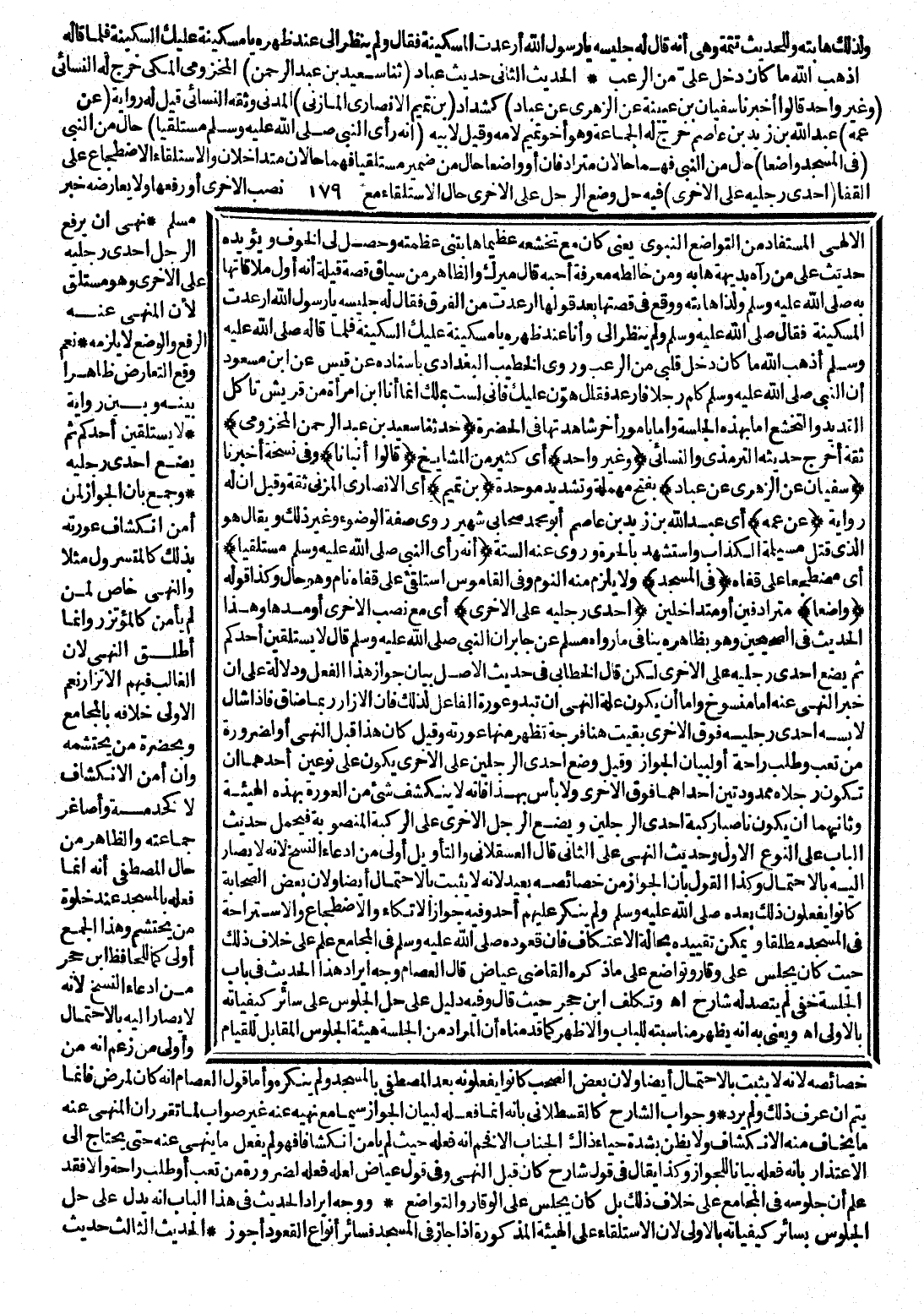 (حَدَّثَنَا سَعِيدُ بْنُ عَبْدِ الرَّحْمَنِ الْمَخْزُومِيُّ) ثِقَةٌ أَخْرَجَ حَدِيثَهُ التِّرْمِذِيُّ وَالنَّسَائِيُّ (وَغَيْرُ وَاحِدٍ) أَيْ كَثِيرٌ مِنَ الْمَشَايِخِ (قَالُوا: أَنْبَأَنَا) وَفِي نُسْخَةٍ أَخْبَرَنَا (سُفْيَانُ عَنِ الزُّهْرِيِّ عَنْ عَبَّادِ) بِفَتْحِ مُهْمَلَةٍ وَتَشْدِيدِ مُوَحَّدَةٍ (بْنِ تَمِيمٍ) أَيِ الْأَنْصَارِيِّ الْمُزَنِيِّ ثِقَةٌ، وَقِيلَ: إِنَّ لَهُ رِوَايَةً (عَنْ عَمِّهِ) أَيْ عَبْدُ اللَّهِ بْنُ زَيْدِ بْنِ عَاصِمٍ أَبُو مُحَمَّدٍ صَحَابِيٌّ شَهِيرٌ، رَوَى صِفَةَ الْوُضُوءِ وَغَيْرَ ذَلِكَ، وَيُقَالُ: هُوَ الَّذِي قَتَلَ مُسَيْلِمَةَ الْكَذَّابَ، وَاسْتُشْهِدَ بِالْحَرَّةِ، وَرَوَى عَنْهُ السِّتَّةُ (أَنَّهُ رَأَى النَّبِيَّ صَلَّى اللَّهُ عَلَيْهِ وَسَلَّمَ مُسْتَلْقِيًا) أَيْ مُضْطَجِعًا عَلَى قَفَاهُ (فِي الْمَسْجِدِ) وَلَا يَلْزَمُ مِنْهُ النَّوْمُ، وَفِي الْقَامُوسِ اسْتَلْقَى عَلَى قَفَاهُ نَامَ وَهُوَ حَالٌ، وَكَذَا قَوْلُهُ: (وَاضِعًا) مُتَرَادِفَيْنِ