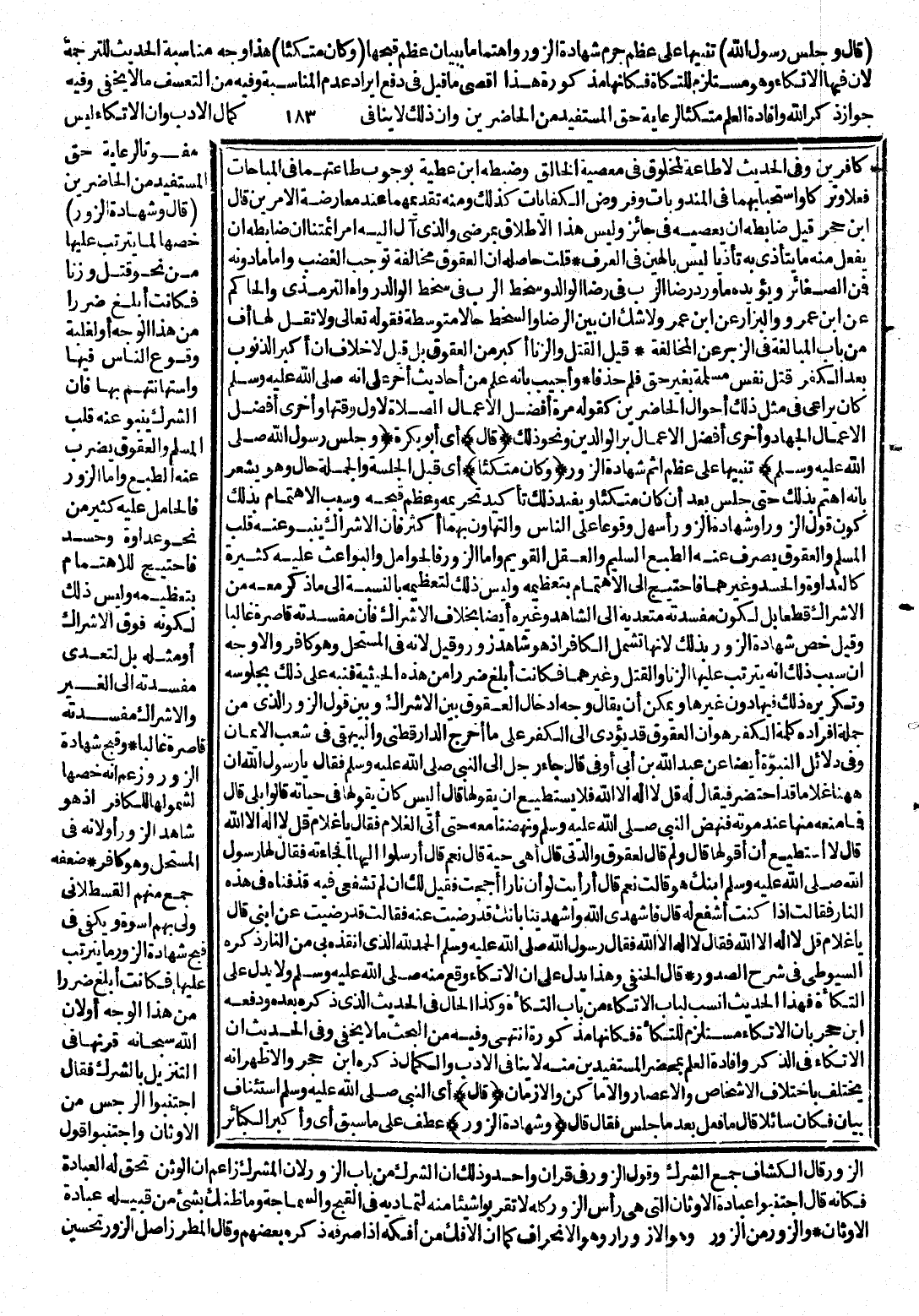 دُونَ غَيْرِهَا، وَيُمْكِنُ أَنْ يُقَالَ وَجْهُ إِدْخَالِ الْعُقُوقِ بَيْنَ الْإِشْرَاكِ، وَبَيْنَ قَوْلِ الزُّورِ الَّذِي مِنْ جُمْلَةِ أَفْرَادِهِ كَلِمَةُ الْكُفْرِ، هُوَ أَنَّ الْعُقُوقَ قَدْ يُؤَدِّي إِلَى الْكُفْرِ عَلَى مَا أَخْرَجَ الدَّارَقُطْنِيُّ وَالْبَيْهَقِيُّ، فِي شُعَبِ الْإِيمَانِ، وَفِي دَلَائِلِ النُّبُوَّةِ أَيْضًا، عَنْ عَبْدِ اللَّهِ بْنِ أَبِي أَوْفَى، قَالَ: جَاءَ رَجُلٌ إِلَى النَّبِيِّ صَلَّى اللَّهُ عَلَيْهِ وَسَلَّمَ، فَقَالَ: يَا رَسُولَ اللَّهِ إِنَّ هَاهُنَا غُلَامًا قَدِ احْتُضِرَ، فَيُقَالُ لَهُ: قُلْ: لَا إِلَهَ إِلَّا اللَّهُ فَلَا يَسْتَطِيعُ أَنْ يَقُولَهَا، قَالَ: أَلَيْسَ كَانَ يَقُولُهَا فِي حَيَاتِهِ، قَالُوا: بَلَى قَالَ، فَمَا مَنَعَهُ مِنْهَا عِنْدَ مَوْتِهِ، فَنَهَضَ النَّبِيُّ صَلَّى اللَّهُ عَلَيْهِ وَسَلَّمَ، وَنَهَضْنَا مَعَهُ، حَتَّى أَتَى الْغُلَامَ، فَقَالَ: يَا غُلَامُ قُلْ: لَا إِلَهَ إِلَّا اللَّهُ، قَالَ: لَا أَسْتَطِيعُ أَنْ أَقُولَهَا، قَالَ: وَلِمَ، قَالَ: لِعُقُوقِ وَالِدَتِي، قَالَ: أَهِيَ حَيَّةٌ؟ قَالَ: نَعَمْ، قَالَ: أَرْسِلُوا إِلَيْهَا، فَجَاءَتْهُ فَقَالَ لَهَا رَسُولُ اللَّهِ صَلَّى اللَّهُ عَلَيْهِ وَسَلَّمَ: ابْنُكِ هُوَ؟ قَالَتْ: نَعَمْ، قَالَ: أَرَأَيْتِ لَوْ أَنَّ نَارًا أُجِّجَتْ، فَقِيلَ لَكِ: إِنْ لَمْ تَشْفَعِي فِيهِ قَذَفْنَاهُ فِي هَذِهِ النَّارِ، فَقَالَتْ: إِذًا كُنْتُ أَشْفَعُ لَهُ، قَالَ: فَأَشْهِدِي اللَّهَ، وَأَشْهِدِينَا بِأَنَّكِ قَدْ رَضِيتِ عَنْهُ، فَقَالَتْ: قَدْ رَضِيتُ عَنِ ابْنِي، قَالَ: يَا غُلَامُ قُلْ: لَا إِلَهَ إِلَّا اللَّهُ، فَقَالَ: لَا إِلَهَ إِلَّا اللَّهُ، فَقَالَ رَسُولُ اللَّهِ صَلَّى اللَّهُ عَلَيْهِ وَسَلَّمَ: الْحَمْدُ لِلَّهِ الَّذِي أَنْقَذَهُ بِي مِنَ النَّارِ، ذَكَرَهُ السُّيُوطِيُّ فِي شَرْحِ الصُّدُورِ.