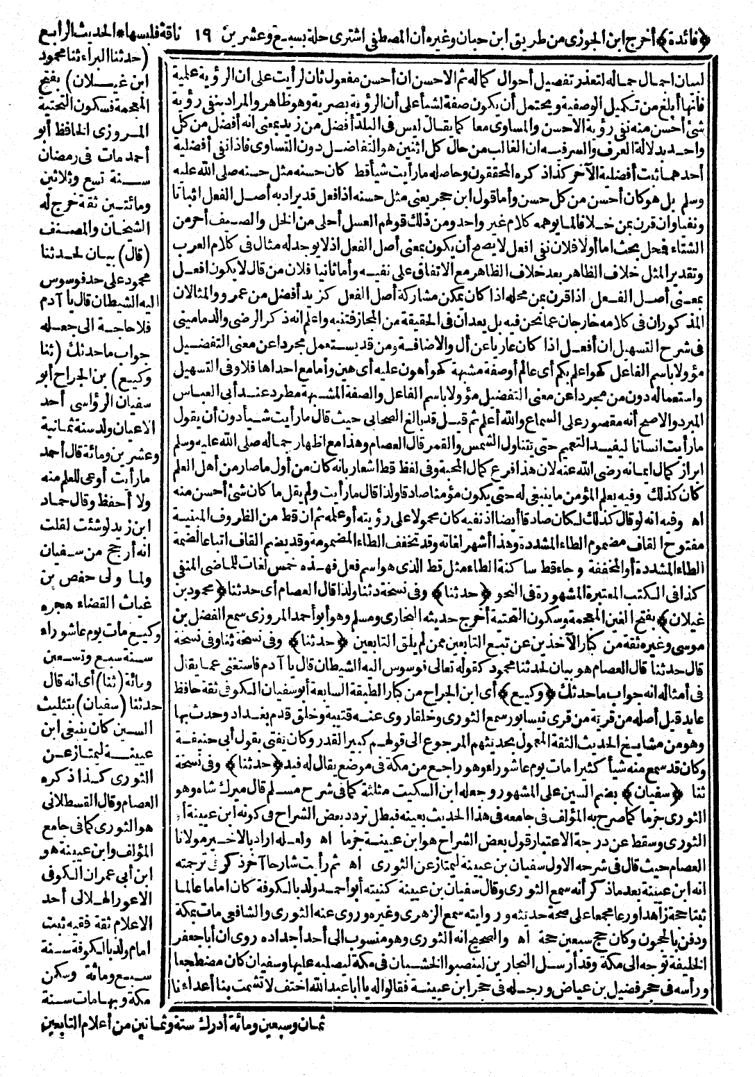 قَوْلِهِمْ كَبِيرُ الْقَدْرِ، وَكَانَ يُفْتِي بِقَوْلِ أَبِي حَنِيفَةَ، وَكَانَ قَدْ سَمِعَ مِنْهُ شَيْئًا كَثِيرًا، مَاتَ يَوْمَ عَاشُورَاءَ وَهُوَ رَاجِعٌ مِنْ مَكَّةَ فِي مَوْضِعٍ يُقَالُ لَهُ فَيْدٌ. (حَدَّثَنَا) : وَفِي نُسْخَةٍ ثَنَا. (سُفْيَانُ) : بِضَمِّ السِّينِ عَلَى الْمَشْهُورِ وَجَعَلَهُ ابْنُ السِّكِّيتِ مُثَلَّثَةً كَمَا فِي شَرْحِ مُسْلِمٍ، قَالَ: مِيرَكُ شَاهْ وَهُوَ الثَّوْرِيُّ جَزْمًا كَمَا صَرَّحَ بِهِ الْمُؤَلِّفُ فِي جَامِعِهِ فِي هَذَا الْحَدِيثِ بِعَيْنِهِ فَبَطَلَ تَرَدُّدُ بَعْضِ الشُّرَّاحِ فِي كَوْنِهِ ابْنَ عُيَيْنَةَ أَوِ الثَّوْرِيَّ، وَسَقَطَ عَلَى دَرَجَةِ الِاعْتِبَارِ قَوْلُ بَعْضِ الشُّرَّاحِ هُوَ ابْنُ عُيَيْنَةَ جَزْمًا، انْتَهَى. وَلَعَلَّهُ أَرَادَ بِالْأَخِيرِ مَوْلَانَا الْعِصَامُ ; حَيْثُ قَالَ فِي شَرْحِهِ الْأَوَّلِ: سُفْيَانُ بْنُ عُيَيْنَةَ لِيَمْتَازَ عَنِ الثَّوْرِيِّ، انْتَهَى. ثُمَّ رَأَيْتُ شَارِحًا آخَرَ ذَكَرَ فِي تَرْجَمَتِهِ أَنَّهُ ابْنُ عُيَيْنَةَ بَعْدَ مَا ذَكَرَ أَنَّهُ سَمِعَ الثَّوْرِيَّ، وَقَالَ: سُفْيَانُ بْنُ عُيَيْنَةَ كُنْيَتُهُ أَبُو أَحْمَدَ، وُلِدَ بِالْكُوفَةِ، كَانَ إِمَامًا عَالِمًا ثَبْتًا حُجَّةً زَاهِدًا وَرِعًا مُجْمَعًا عَلَى صِحَّةِ حَدِيثِهِ وَرِوَايَتِهِ، سَمِعَ الزُّهْرِيَّ وَغَيْرَهُ، وَرَوَى عَنْهُ الثَّوْرِيُّ وَالشَّافِعِيُّ مَاتَ بِمَكَّةَ وَدُفِنَ بِالْحَجُونِ، وَكَانَ حَجَّ سَبْعِينَ حَجَّةً، انْتَهَى. وَالصَّحِيحُ أَنَّهُ الثَّوْرِيُّ، وَهُوَ مَنْسُوبٌ إِلَى أَحَدِ أَجْدَادِهِ، رُوِيَ أَنَّ أَبَا جَعْفَرٍ الْخَلِيفَةَ تَوَجَّهَ إِلَى مَكَّةَ وَقَدْ أَرْسَلَ النَّجَّارِينَ لِيَنْصِبُوا الْخُشْبَانَ فِي مَكَّةَ لِيَصْلِبَهُ عَلَيْهَا، وَسُفْيَانُ كَانَ مَضْطَجِعًا وَرَأْسُهُ فِي حِجْرِ فُضَيْلِ بْنِ عِيَاضٍ وَرِجْلُهُ فِي حِجْرِ ابْنِ عُيَيْنَةَ فَقَالُوا لَهُ: يَا أَبَا عَبْدِ اللَّهِ اخْتَفِ لَا تُشْمِتْ بِنَا أَعْدَاءَنَا،